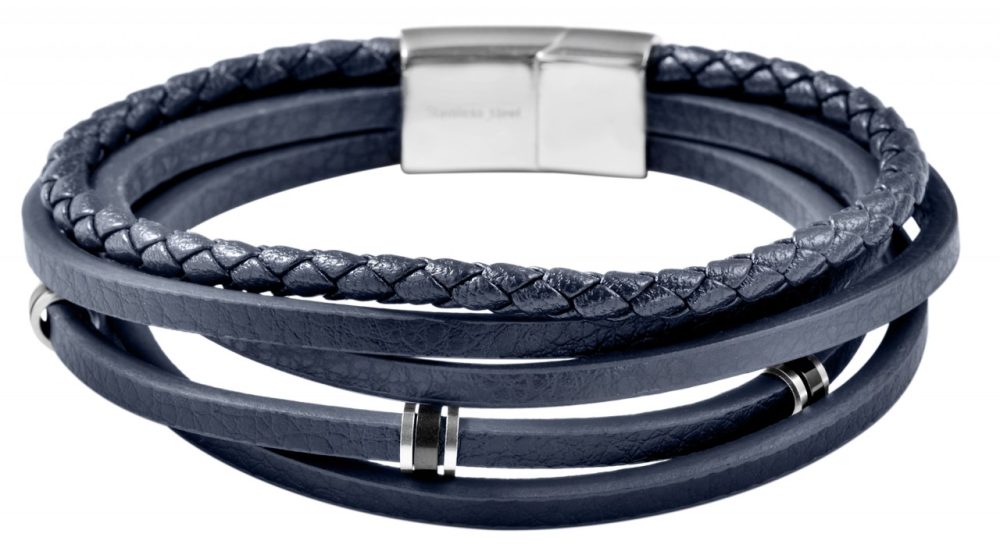 A pulseira azul escura da Raptor é feita de couro genuíno e tem 21 cm de comprimento. A pulseira de cinco fileiras consiste em quatro tiras de couro de 4 mm de largura e um cordão trançado. Elementos brilhantes de aço inoxidável são apresentados em uma pulseira, que completam habilmente o design. Com um fecho magnético prático e sólido, pode ser aberto e fechado com facilidade e também pode ser decorado com pequenas gravuras. A combinação de diferentes materiais torna esta pulseira especial e fica bem em pulsos femininos e masculinos. Com este produto você obtém o acessório perfeito para presentear seus entes queridos com uma joia original ou para se presentear.