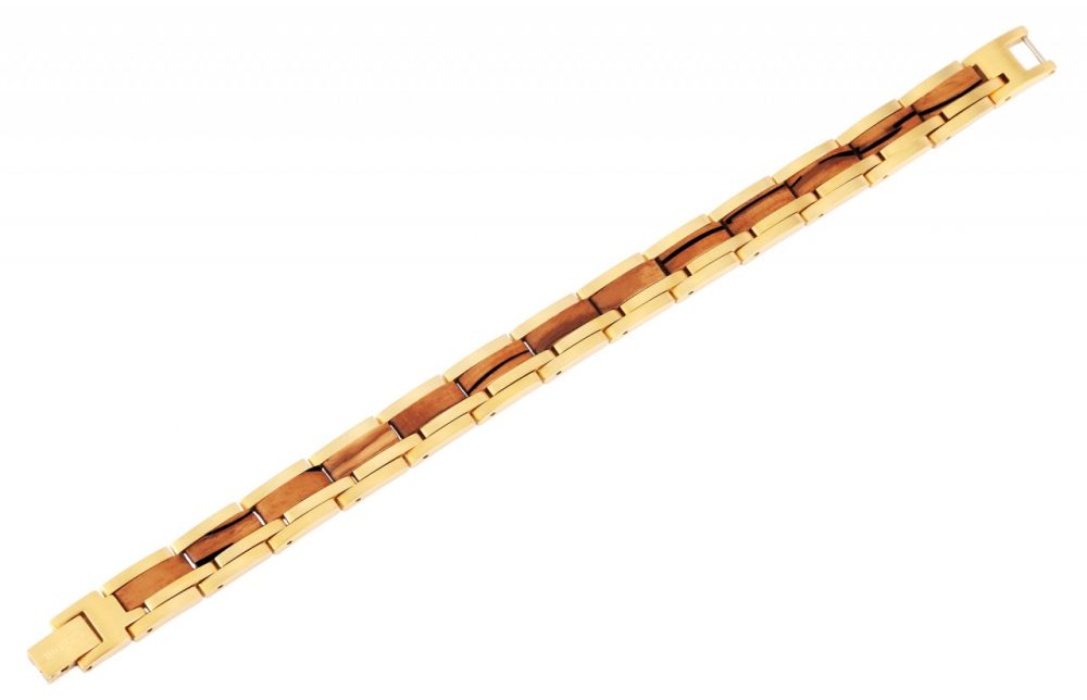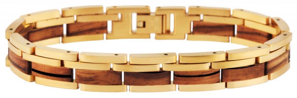 A pulseira de joias da marca Raptor é feita de aço inoxidável e madeira e é composta por 16 elementos conectados por alfinetes. A pulseira parece ter quatro fileiras devido ao tipo e disposição dos elementos. O destaque visual desta joia especial são os elementos de madeira de 4 mm de largura que foram incorporados na lateral da pulseira. Como os elementos estão conectados por pinos, é possível ajustar a pulseira a qualquer tamanho de pulso. A joia tem largura de 10 mm e espessura de material de 3 mm. O comprimento total da pulseira é de 21 cm. A combinação de aço inoxidável e madeira confere à pulseira de joias Raptor um visual muito especial.