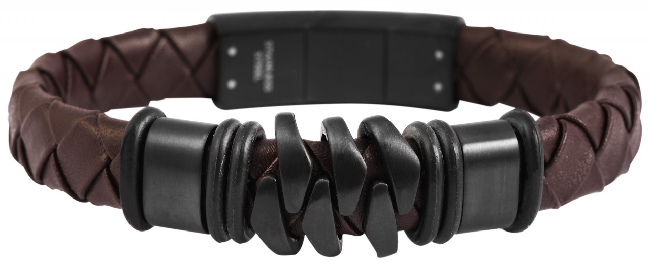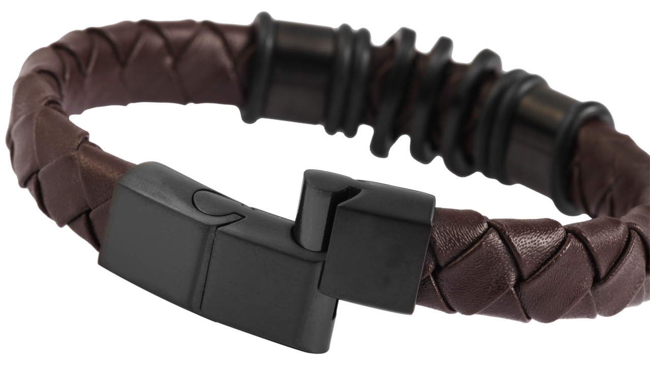 A pulseira castanha de pele genuína da marca Raptor é feita de uma pulseira de pele trançado de 11,5 mm de largura. O destaque visual desta moderna pulseira de joias é um elemento de aço inoxidável preto inserido no meio. A pulseira pode ser aberta e fechada com um prático fecho magnético em aço inoxidável, também preto. As dimensões da pulseira de pele são comprimento total de 21,5 cm, largura de 17 mm e espessura de 10 mm. Usando um elemento removível no fecho, o comprimento total da joia pode ser reduzido em 1 cm. A pulseira de couro genuíno é uma ótima companheira para o dia a dia e pode ser facilmente combinada com qualquer estilo de roupa.