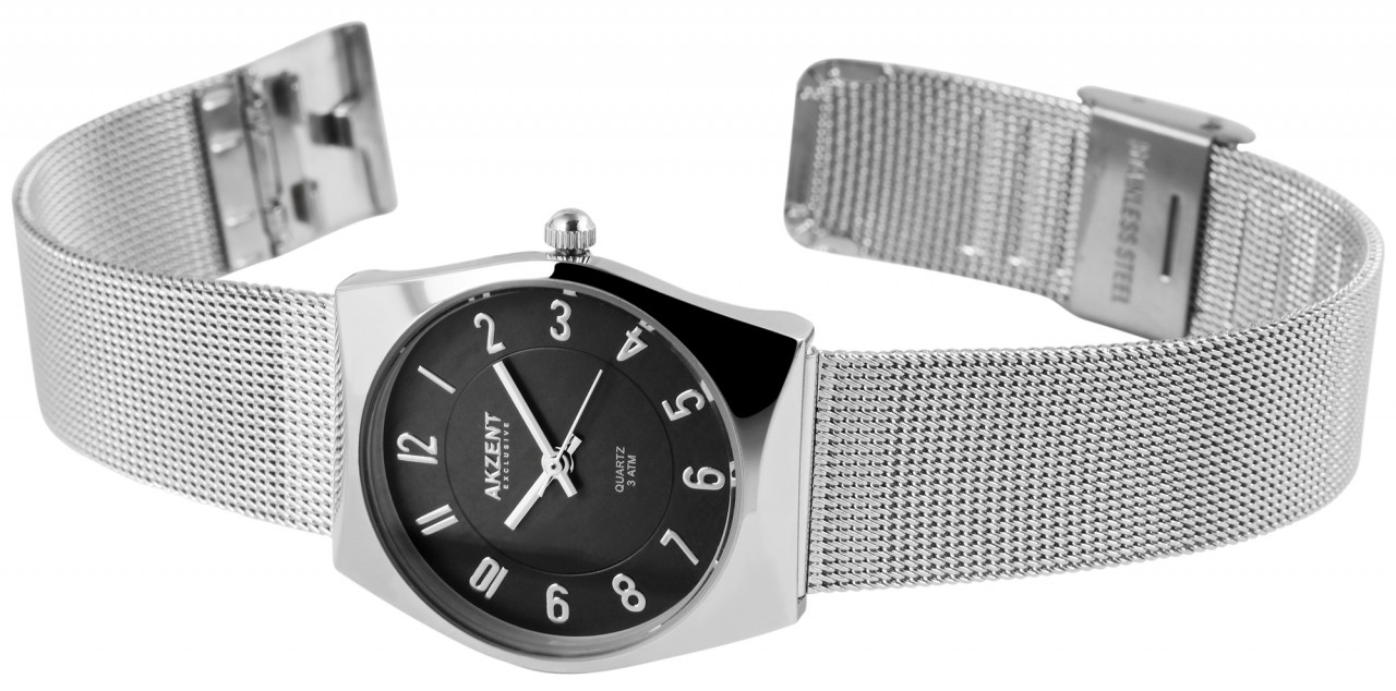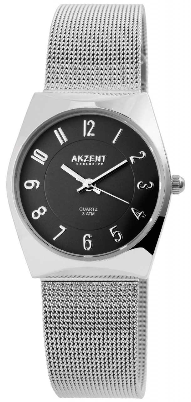 O relógio de pulso analógico de 3 ponteiros para senhora da marca Akzent Exclusive possui um movimento de quartzo de alta qualidade. A bracelete milanesa em aço inoxidável tem 18 mm de largura na extremidade e pode ser aberta e fechada com um fecho de gancho em aço inoxidável. O comprimento total do relógio é de 21,5 cm. A caixa metálica com vidro mineral tem um diâmetro de 30 mm e uma altura de 8 mm. O fundo da caixa também é feito de aço inoxidável e o relógio tem uma resistência à água de 3 ATM. Os ponteiros e os índices são da mesma cor e combinam bem com o aspeto geral do relógio. O mostrador mantém-se simples. O relógio é muito confortável de usar, uma vez que a bracelete milanesa se ajusta perfeitamente ao pulso. É um belo acessório que pode ser combinado de várias formas.