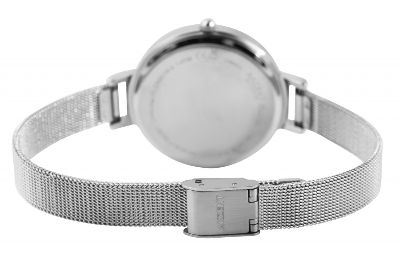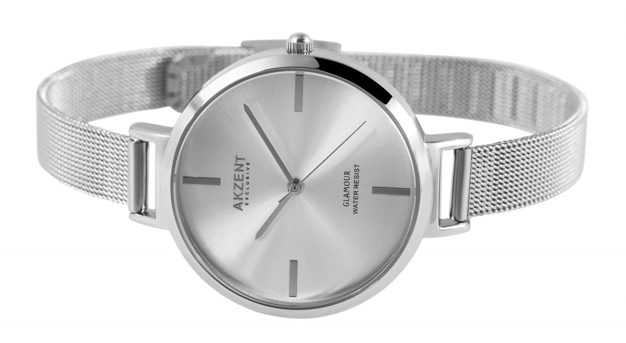 O relógio de pulso analógico de 3 ponteiros para senhora da marca Akzent Exclusive possui um movimento de quartzo de alta qualidade. A bracelete milanesa em aço inoxidável tem 10 mm de largura no lug e pode ser aberta e fechada com um fecho de gancho em aço inoxidável. O comprimento total do relógio é de 22 cm. A caixa metálica com vidro mineral tem um diâmetro de 36 mm e uma altura de 8 mm. O fundo da caixa também é feito de aço inoxidável e o relógio tem uma resistência à água de 3 ATM. Os ponteiros e os índices são da mesma cor e combinam bem com o aspeto geral do relógio. O mostrador mantém-se simples. O relógio é muito confortável de usar, uma vez que a bracelete milanesa se ajusta perfeitamente ao pulso. É um belo acessório que pode ser combinado de várias formas.