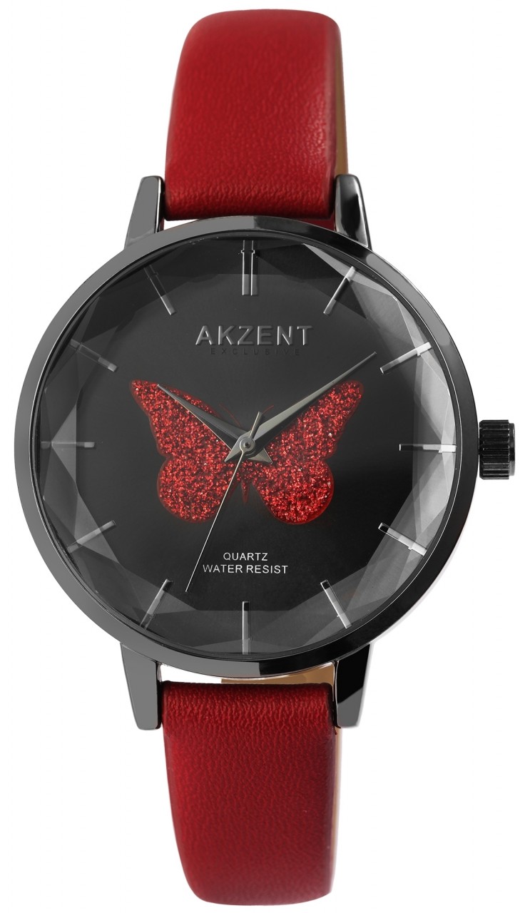 O relógio de pulso analógico feminino de 3 ponteiros da marca Akzent Exclusive possui um movimento de quartzo de alta qualidade. A pulseira em imitação de couro tem 14 mm de largura na alça e pode ser aberta e fechada com uma fivela. O comprimento total do relógio é de 24 cm. A caixa de metal com vidro mineral tem um diâmetro de 38 mm e uma altura de 9 mm. O fundo da caixa é feito de aço inoxidável e o relógio tem resistência à água de 3 bar. Um destaque visual é o mostrador, decorado ao centro com uma borboleta que brilha na cor da pulseira. Outro destaque visual é o vidro, cuja borda externa é retificada em diferentes ângulos para que tenha muitas facetas. Eles são visíveis de todos os ângulos e conferem ao relógio uma aparência particularmente elegante. Os ponteiros e índices são feitos na cor da caixa.
