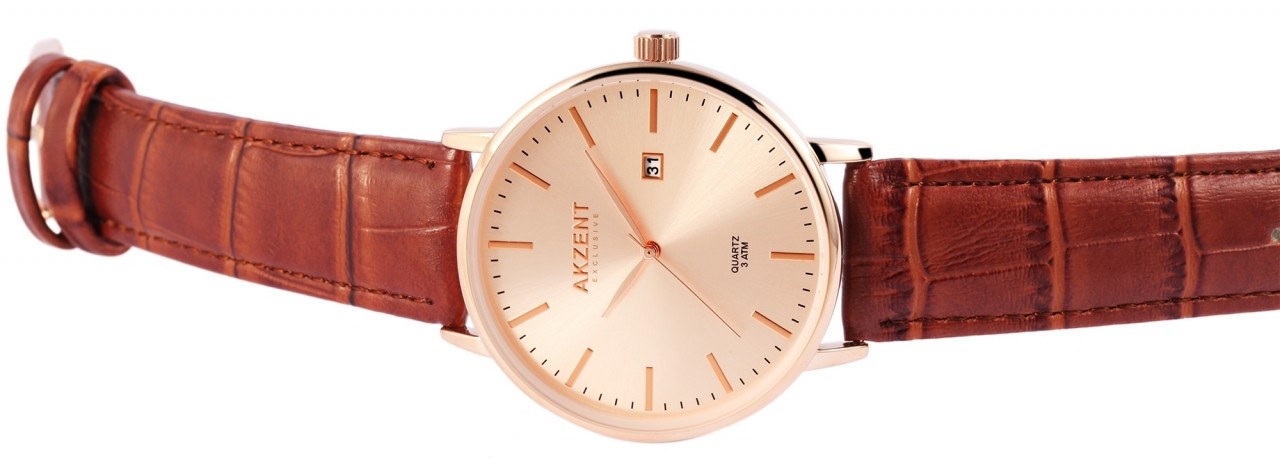 O relógio de pulso analógico de 3 ponteiros para homem da marca Akzent Exclusive possui um movimento de quartzo de alta qualidade. A pulseira em pele sintética tem 20 mm de largura na alça e pode ser aberta e fechada com uma fivela. O comprimento total do relógio é de 25,5 cm. A caixa de metal com vidro mineral tem um diâmetro de 42 mm e uma altura de 10 mm. O fundo da caixa é feito de aço inoxidável e o relógio tem resistência à água de 3 bar. O mostrador é simples e os ponteiros e números são monocromáticos. O relógio impressiona pela sua elegância simples e pode ser combinado de várias maneiras.