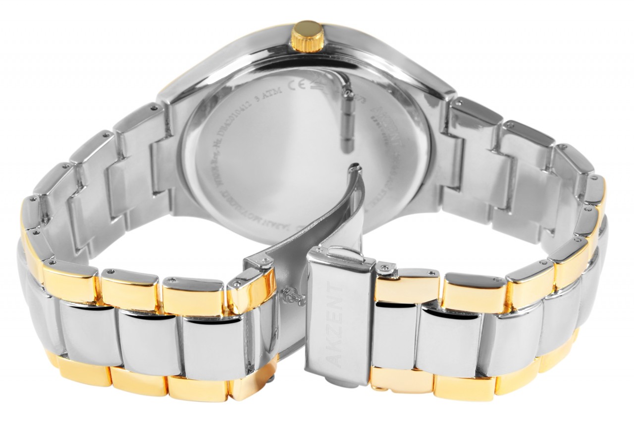 O relógio de pulso analógico de 3 ponteiros para homem da marca Akzent Exclusive possui um movimento de quartzo de alta qualidade. A pulseira de metal tem 22 mm de largura na alça e pode ser aberta e fechada com um fecho de clipe. O comprimento total do relógio é de 22 cm. A caixa de metal com vidro mineral tem um diâmetro de 42 mm e uma altura de 9 mm. O fundo da caixa é feito de aço inoxidável e o relógio tem resistência à água de 3 ATM. Um destaque visual é a borda espelhada preta de 4 mm de largura no vidro, que confere ao relógio uma aparência particularmente elegante. O mostrador é simples e possui quatro índices de pontos. Os ponteiros e índices têm a mesma cor e combinam bem com a aparência geral do relógio.