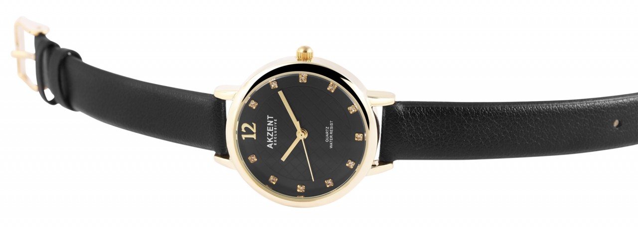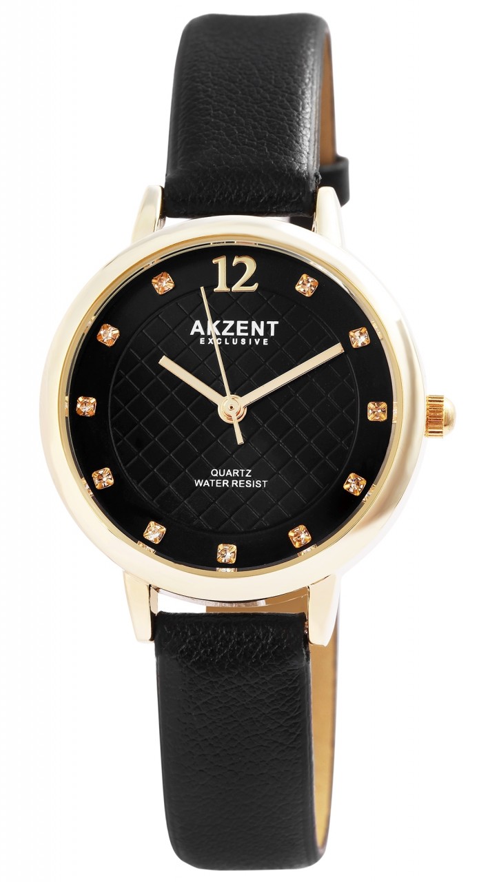 O relógio de pulso analógico feminino de 3 ponteiros da marca Akzent Exclusive possui um movimento de quartzo de alta qualidade. A pulseira em imitação de couro tem 12 mm de largura na alça e pode ser aberta e fechada com uma fivela. O comprimento total do relógio é de 23 cm. A caixa de metal com vidro mineral tem um diâmetro de 31 mm e uma altura de 8 mm. O fundo da caixa é feito de aço inoxidável e o relógio tem resistência à água de 3 ATM. Um destaque visual é o mostrador, que possui um anel visualmente separado no qual onze pedras semelhantes decoram o relógio com índices de pontos. Além disso, o círculo interno é discretamente destacado com um padrão xadrez. Às doze horas há um número da mesma cor dos ponteiros.