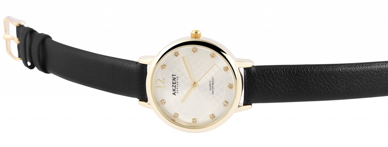 O relógio de pulso analógico feminino de 3 ponteiros da marca Akzent Exclusive possui um movimento de quartzo de alta qualidade. A pulseira em imitação de couro tem 12 mm de largura na alça e pode ser aberta e fechada com uma fivela. O comprimento total do relógio é de 23 cm. A caixa de metal com vidro mineral tem um diâmetro de 31 mm e uma altura de 8 mm. O fundo da caixa é feito de aço inoxidável e o relógio tem resistência à água de 3 ATM. Um destaque visual é o mostrador, que possui um anel visualmente separado no qual onze pedras semelhantes decoram o relógio com índices de pontos. Além disso, o círculo interno é discretamente destacado com um padrão xadrez. Às doze horas há um número da mesma cor dos ponteiros.