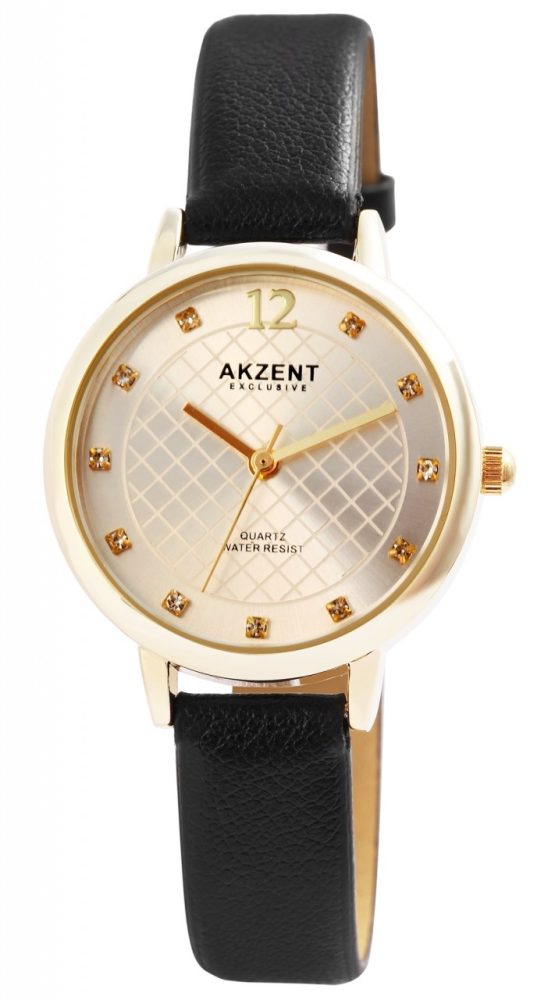 O relógio de pulso analógico feminino de 3 ponteiros da marca Akzent Exclusive possui um movimento de quartzo de alta qualidade. A pulseira em imitação de couro tem 12 mm de largura na alça e pode ser aberta e fechada com uma fivela. O comprimento total do relógio é de 23 cm. A caixa de metal com vidro mineral tem um diâmetro de 31 mm e uma altura de 8 mm. O fundo da caixa é feito de aço inoxidável e o relógio tem resistência à água de 3 ATM. Um destaque visual é o mostrador, que possui um anel visualmente separado no qual onze pedras semelhantes decoram o relógio com índices de pontos. Além disso, o círculo interno é discretamente destacado com um padrão xadrez. Às doze horas há um número da mesma cor dos ponteiros.