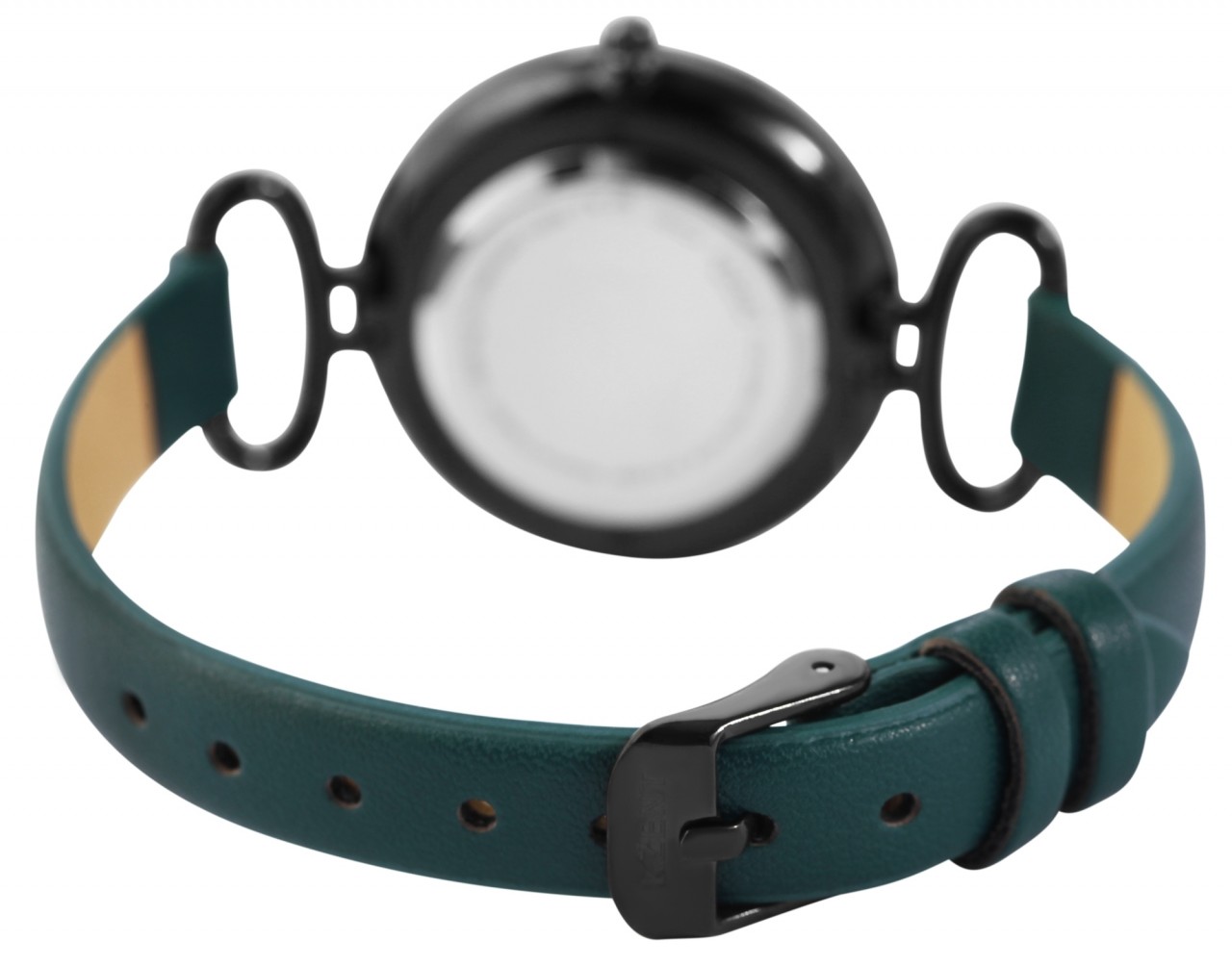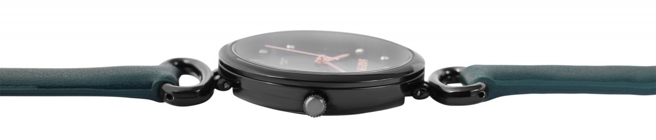O relógio de pulso analógico feminino de 3 ponteiros da marca Akzent Exclusive possui um movimento de quartzo de alta qualidade. A pulseira de imitação de couro tem 10 mm de largura na alça e está conectada à caixa por um anel de metal oval semiaberto. Pode ser aberto e fechado com uma fivela de pino. O comprimento total do relógio é de 23,5 cm. A caixa de metal com vidro mineral tem um diâmetro de 33 mm e uma altura de 8 mm. O fundo da caixa é feito de aço inoxidável e o relógio tem resistência à água de 3 ATM. Um destaque visual é o mostrador, que é incrustado com oito pedras simil. Estes também assumem a função de índices de pontos. Os ponteiros e índices às doze, três, seis e nove horas têm a mesma cor e, portanto, combinam particularmente bem com a aparência geral do relógio.
