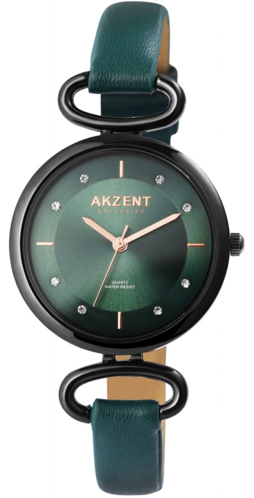 O relógio de pulso analógico feminino de 3 ponteiros da marca Akzent Exclusive possui um movimento de quartzo de alta qualidade. A pulseira de imitação de couro tem 10 mm de largura na alça e está conectada à caixa por um anel de metal oval semiaberto. Pode ser aberto e fechado com uma fivela de pino. O comprimento total do relógio é de 23,5 cm. A caixa de metal com vidro mineral tem um diâmetro de 33 mm e uma altura de 8 mm. O fundo da caixa é feito de aço inoxidável e o relógio tem resistência à água de 3 ATM. Um destaque visual é o mostrador, que é incrustado com oito pedras simil. Estes também assumem a função de índices de pontos. Os ponteiros e índices às doze, três, seis e nove horas têm a mesma cor e, portanto, combinam particularmente bem com a aparência geral do relógio.