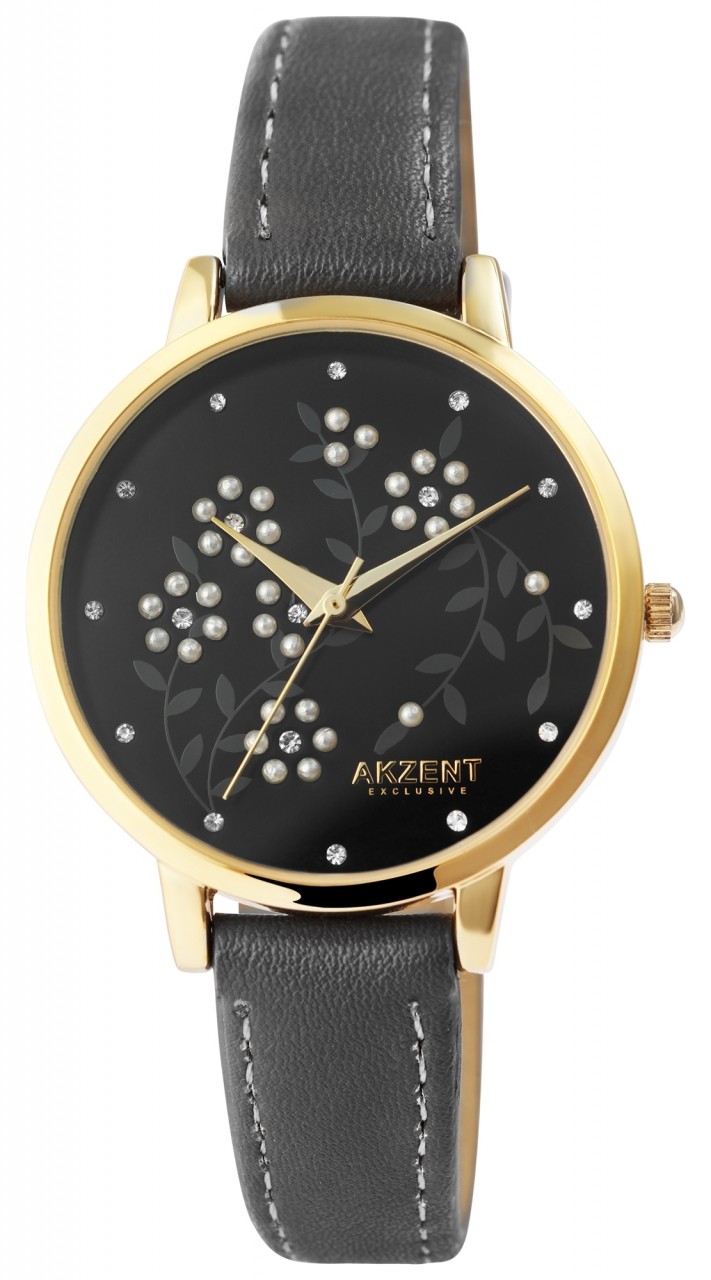 O relógio de pulso analógico feminino de 3 ponteiros da marca Akzent Exclusive possui um movimento de quartzo de alta qualidade. A pulseira em pele sintética tem 14 mm de largura na alça e pode ser aberta e fechada com uma fivela. O comprimento total do relógio é de 23,5 cm. A caixa de metal com vidro mineral tem um diâmetro de 36 mm e uma altura de 9 mm. O fundo da caixa é feito de aço inoxidável e o relógio tem resistência à água de 3 ATM. Um destaque visual é o mostrador, que é decorado com diversas flores, cada uma delas composta por seis pérolas brancas. O interior da flor consiste em uma pequena pedra simili. Existem também doze símiles adicionais no mostrador que servem como índices de pontos. Os ponteiros são feitos na cor da caixa e combinam bem com a aparência geral do relógio.