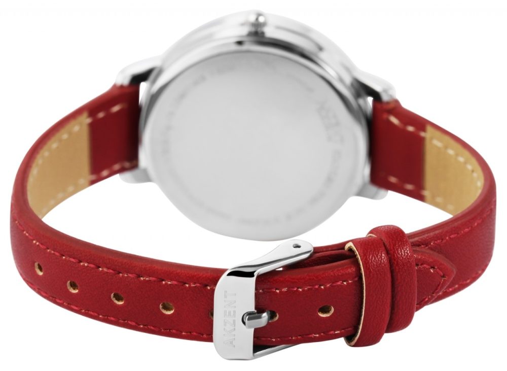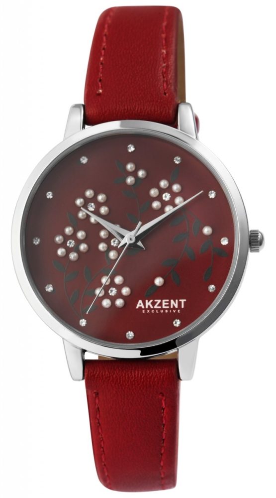 O relógio de pulso analógico feminino de 3 ponteiros da marca Akzent Exclusive possui um movimento de quartzo de alta qualidade. A pulseira em imitação de couro tem 14 mm de largura na alça e pode ser aberta e fechada com uma fivela. O comprimento total do relógio é de 23,5 cm. A caixa de metal com vidro mineral tem um diâmetro de 36 mm e uma altura de 9 mm. O fundo da caixa é feito de aço inoxidável e o relógio tem resistência à água de 3 ATM. Um destaque visual é o mostrador, que é decorado com diversas flores, cada uma delas composta por seis pérolas brancas. O interior da flor consiste em uma pequena pedra simili. Existem também doze símiles adicionais no mostrador que servem como índices de pontos. Os ponteiros são feitos na cor da caixa e combinam bem com a aparência geral do relógio.