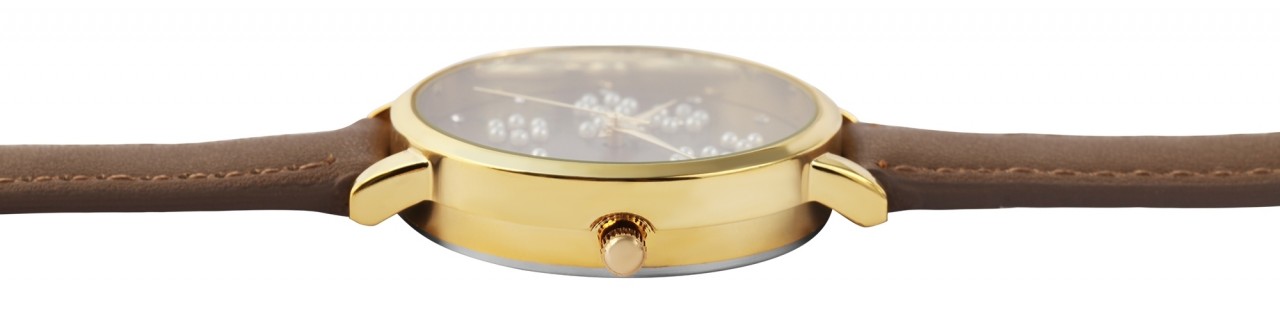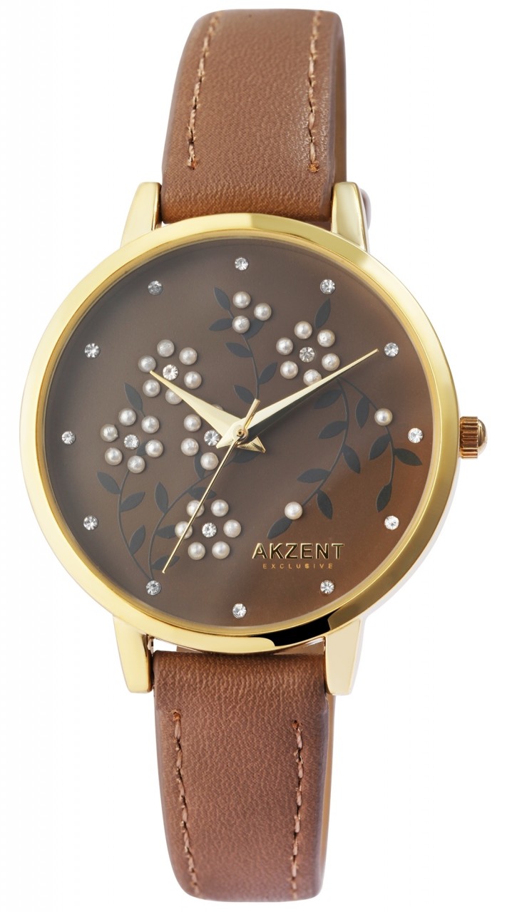 O relógio de pulso analógico feminino de 3 ponteiros da marca Akzent Exclusive possui um movimento de quartzo de alta qualidade. A pulseira em imitação de couro tem 14 mm de largura na alça e pode ser aberta e fechada com uma fivela. O comprimento total do relógio é de 23,5 cm. A caixa de metal com vidro mineral tem um diâmetro de 36 mm e uma altura de 9 mm. O fundo da caixa é feito de aço inoxidável e o relógio tem resistência à água de 3 ATM. Um destaque visual é o mostrador, que é decorado com diversas flores, cada uma delas composta por seis pérolas brancas. O interior da flor consiste em uma pequena pedra simili. Existem também doze símiles adicionais no mostrador que servem como índices de pontos. Os ponteiros são feitos na cor da caixa e combinam bem com a aparência geral do relógio.