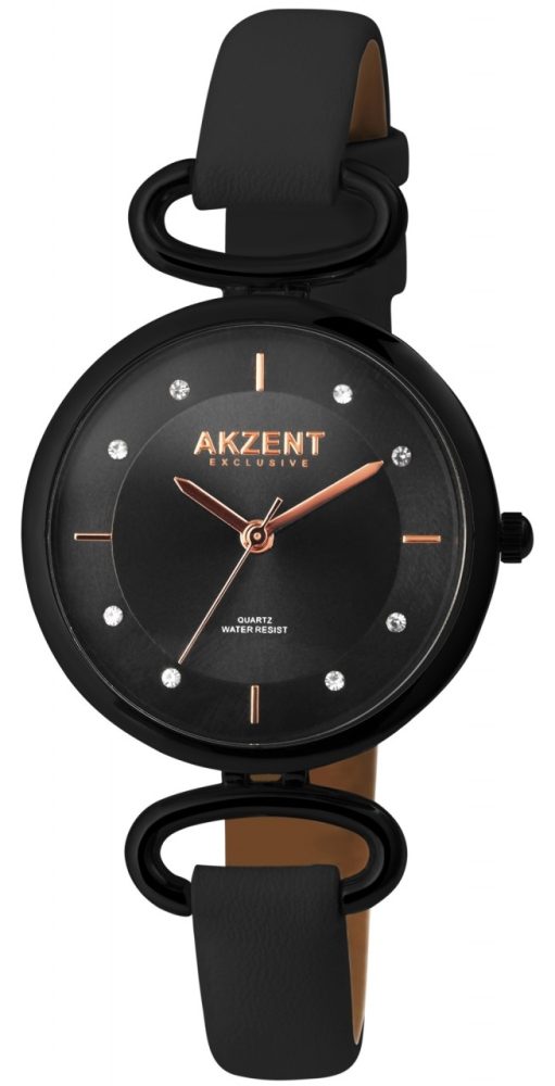 O relógio de pulso analógico de 3 ponteiros para senhora da marca Akzent Exclusive possui um movimento de quartzo de alta qualidade. A bracelete em imitação de pele tem 10 mm de largura na extremidade e está ligada à caixa por uma argola metálica oval semiaberta. Pode ser aberta e fechada com uma fivela de pino. O comprimento total do relógio é de 23,5 cm. A caixa metálica com vidro mineral tem um diâmetro de 33 mm e uma altura de 8 mm. O fundo da caixa é feito de aço inoxidável e o relógio tem uma resistência à água de 3 ATM. Um destaque visual é o mostrador, que é engastado com oito pedras Similis. Estas funcionam também como índices de pontos. Os ponteiros e os marcadores das horas às doze, três, seis e nove horas têm a mesma cor e, por isso, combinam particularmente bem com o aspeto geral do relógio.