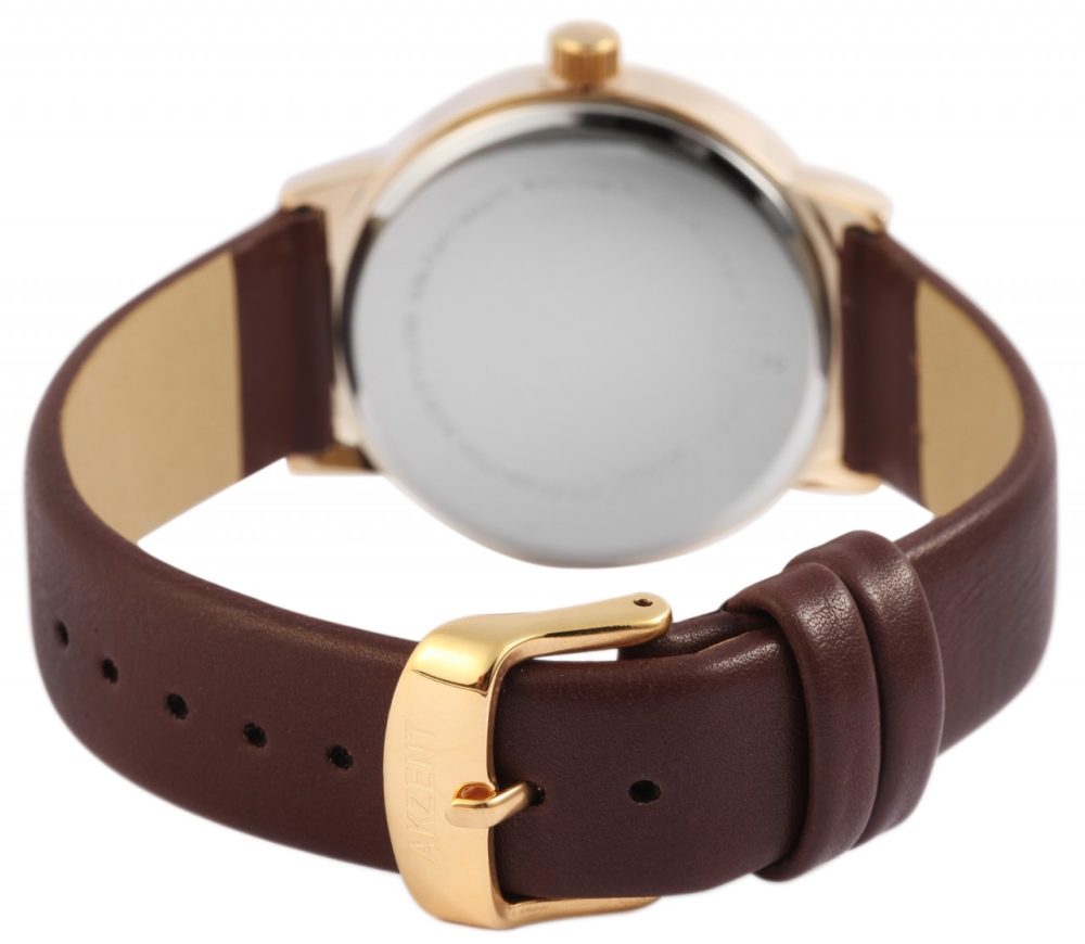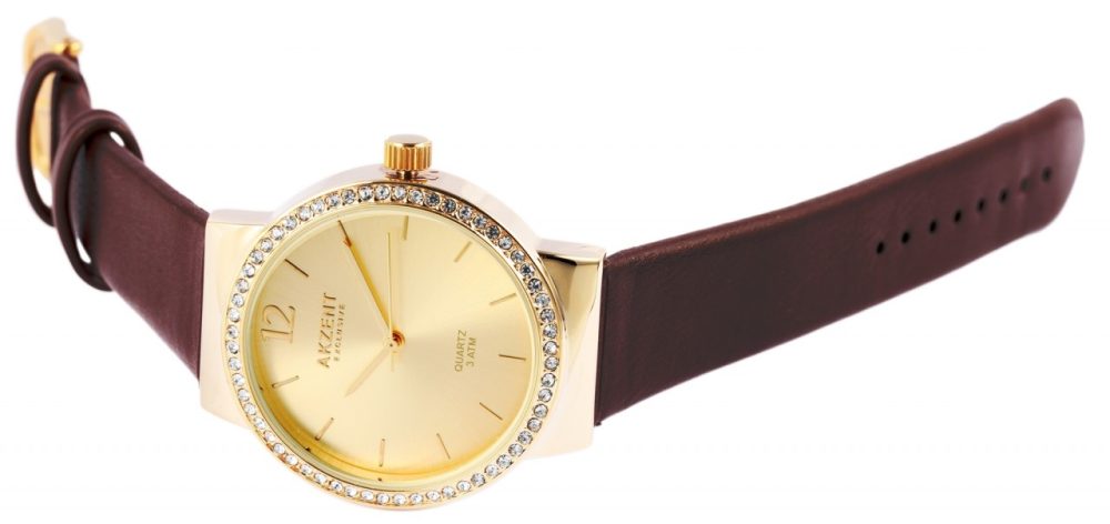 O relógio de pulso analógico de 3 ponteiros para senhora da marca Akzent Exclusive possui um movimento de quartzo de alta qualidade. A bracelete em imitação de pele tem 18 mm de largura na extremidade e pode ser aberta e fechada com uma fivela de pino. O comprimento total do relógio é de 24 cm. A caixa metálica com vidro mineral tem um diâmetro de 36 mm e uma altura de 8,5 mm. O fundo da caixa é feito de aço inoxidável e o relógio tem uma resistência à água de 3 ATM. Um destaque visual é a luneta cravejada com 61 pedras Similis, que confere ao relógio um aspeto particularmente elegante. Os ponteiros e os números são da mesma cor e o mostrador é simples.