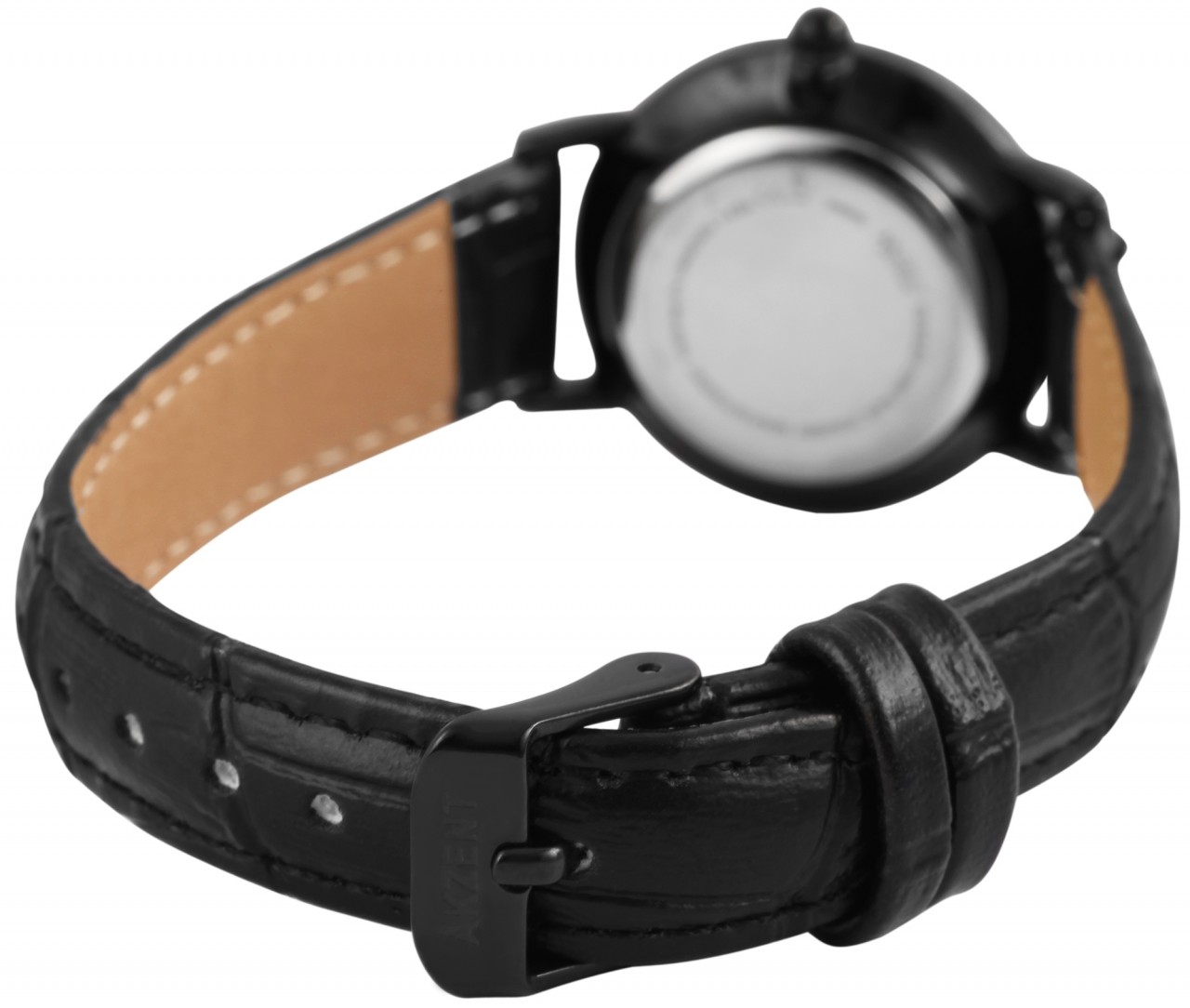 O relógio de pulso analógico de 3 ponteiros para senhora da marca Akzent Exclusive possui um movimento de quartzo de alta qualidade. A bracelete em imitação de pele tem 14 mm de largura na extremidade e pode ser aberta e fechada com uma fivela de pino. O comprimento total do relógio é de 23 cm. A caixa metálica com vidro mineral tem um diâmetro de 28 mm e uma altura de 8 mm. O fundo da caixa é feito de aço inoxidável e o relógio tem uma resistência à água de 3 ATM. Os ponteiros e os índices são da mesma cor e combinam bem com o aspeto geral do relógio. O mostrador mantém-se simples. O relógio é um belo…