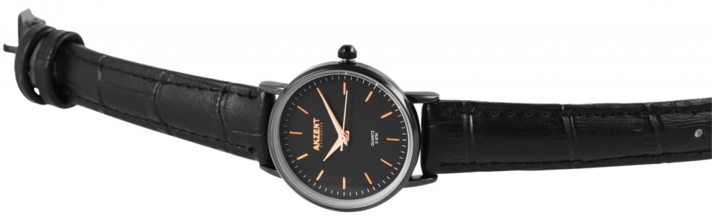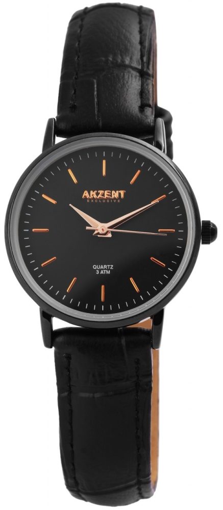 O relógio de pulso analógico de 3 ponteiros para senhora da marca Akzent Exclusive possui um movimento de quartzo de alta qualidade. A bracelete em imitação de pele tem 14 mm de largura na extremidade e pode ser aberta e fechada com uma fivela de pino. O comprimento total do relógio é de 23 cm. A caixa metálica com vidro mineral tem um diâmetro de 28 mm e uma altura de 8 mm. O fundo da caixa é feito de aço inoxidável e o relógio tem uma resistência à água de 3 ATM. Os ponteiros e os índices são da mesma cor e combinam bem com o aspeto geral do relógio. O mostrador mantém-se simples. O relógio é um belo acessório que pode ser combinado de várias formas.