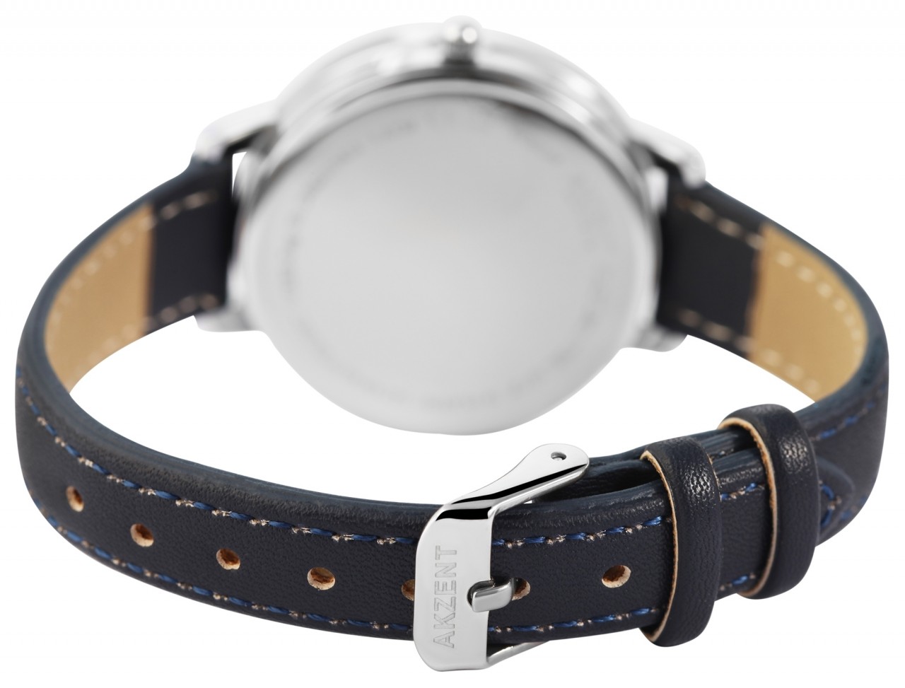 O relógio de pulso analógico feminino de 3 ponteiros da marca Akzent Exclusive possui um movimento de quartzo de alta qualidade. A pulseira em imitação de couro tem 14 mm de largura na alça e pode ser aberta e fechada com uma fivela. O comprimento total do relógio é de 23,5 cm. A caixa de metal com vidro mineral tem um diâmetro de 36 mm e uma altura de 9 mm. O fundo da caixa é feito de aço inoxidável e o relógio tem resistência à água de 3 bar. Um destaque visual é o mostrador, que é decorado com diversas flores, cada uma delas composta por seis pérolas brancas. O interior da flor consiste em uma pequena pedra simili. Existem também doze símiles adicionais no mostrador que servem como índices de pontos. Os ponteiros são feitos na cor da caixa e combinam bem com a aparência geral do relógio.