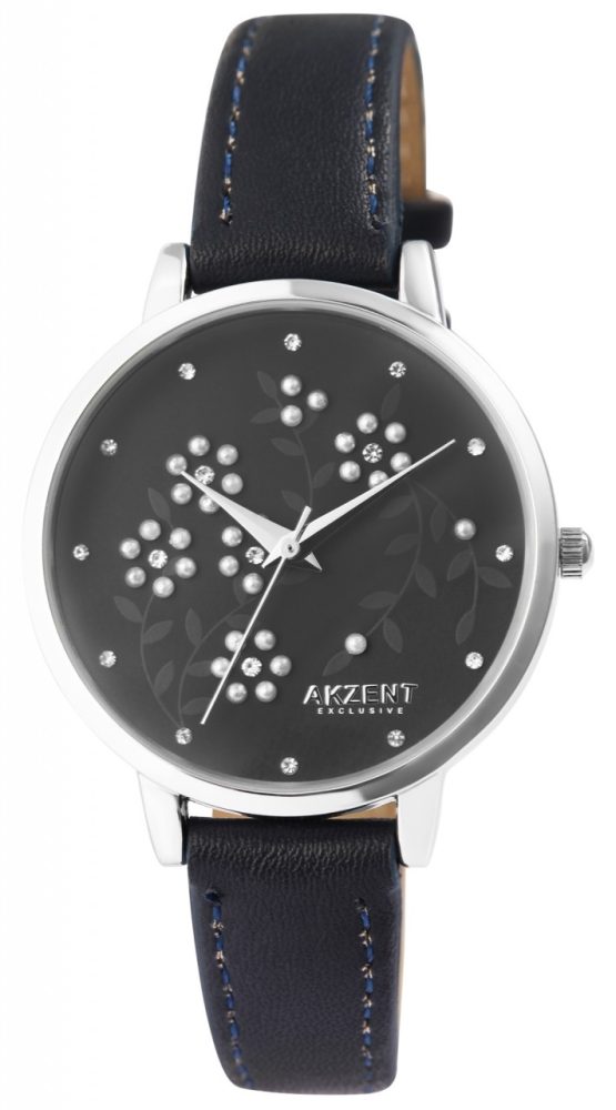 O relógio de pulso analógico feminino de 3 ponteiros da marca Akzent Exclusive possui um movimento de quartzo de alta qualidade. A pulseira em imitação de couro tem 14 mm de largura na alça e pode ser aberta e fechada com uma fivela. O comprimento total do relógio é de 23,5 cm. A caixa de metal com vidro mineral tem um diâmetro de 36 mm e uma altura de 9 mm. O fundo da caixa é feito de aço inoxidável e o relógio tem resistência à água de 3 bar. Um destaque visual é o mostrador, que é decorado com diversas flores, cada uma delas composta por seis pérolas brancas. O interior da flor consiste em uma pequena pedra simili. Existem também doze símiles adicionais no mostrador que servem como índices de pontos. Os ponteiros são feitos na cor da caixa e combinam bem com a aparência geral do relógio.