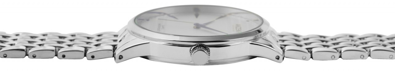 O relógio de pulso analógico de 3 ponteiros para homem da marca Akzent Exclusive possui um movimento de quartzo de alta qualidade. A bracelete metálica tem 22 mm de largura na extremidade e pode ser aberta e fechada com um fecho de correr. O comprimento total do relógio é de 22 cm. A caixa metálica com vidro mineral tem um diâmetro de 42 mm e uma altura de 9 mm. O fundo da caixa é feito de aço inoxidável e o relógio tem uma resistência à água de 3 bar. Um destaque visual é o mostrador, que está decorado com um subtil padrão triangular às seis e às doze horas. Existem também doze marcadores de pontos no mostrador e marcadores de linhas adicionais às duas, três, quatro, oito, nove e dez horas. Os ponteiros e os índices são da mesma cor e combinam bem com o aspeto geral do relógio.