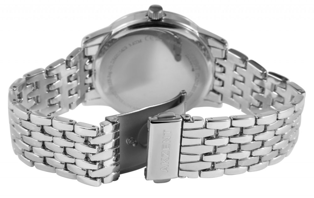 O relógio de pulso analógico de 3 ponteiros para homem da marca Akzent Exclusive possui um movimento de quartzo de alta qualidade. A bracelete metálica tem 22 mm de largura na extremidade e pode ser aberta e fechada com um fecho de correr. O comprimento total do relógio é de 22 cm. A caixa metálica com vidro mineral tem um diâmetro de 42 mm e uma altura de 9 mm. O fundo da caixa é feito de aço inoxidável e o relógio tem uma resistência à água de 3 bar. Um destaque visual é o mostrador, que está decorado com um subtil padrão triangular às seis e às doze horas. Existem também doze marcadores de pontos no mostrador e marcadores de linhas adicionais às duas, três, quatro, oito, nove e dez horas. Os ponteiros e os índices são da mesma cor e combinam bem com o aspeto geral do relógio.