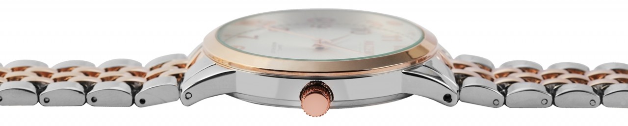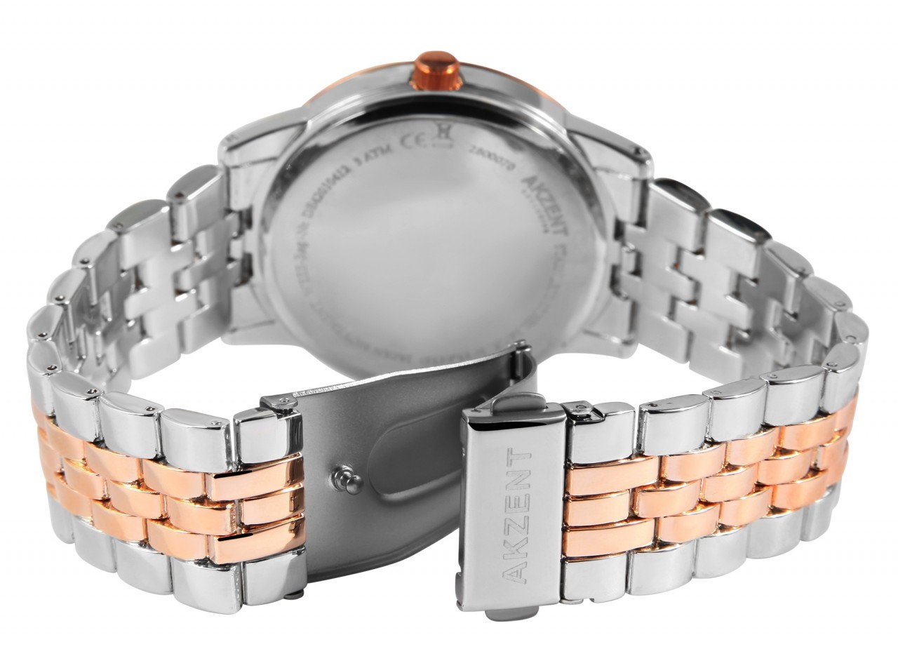 O relógio de pulso analógico de 3 ponteiros para homem da marca Akzent Exclusive possui um movimento de quartzo de alta qualidade. A bracelete metálica tem 22 mm de largura na extremidade e pode ser aberta e fechada com um fecho de correr. O comprimento total do relógio é de 22 cm. A caixa metálica com vidro mineral tem um diâmetro de 42 mm e uma altura de 9 mm. O fundo da caixa é feito de aço inoxidável e o relógio tem uma resistência à água de 3 bar. Um destaque visual é o mostrador, que é canelado do centro para o exterior num padrão radial. Os algarismos deste modelo são também muito grandes, o que facilita particularmente a leitura das horas. Os ponteiros e os algarismos são da mesma cor e combinam bem com o aspeto geral do relógio.