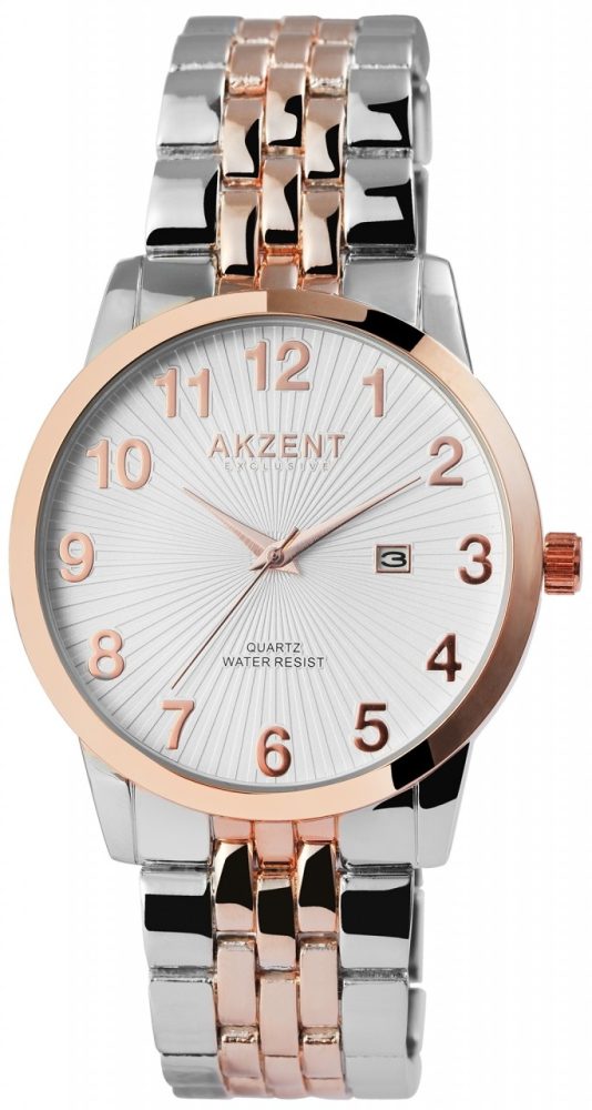 O relógio de pulso analógico de 3 ponteiros para homem da marca Akzent Exclusive possui um movimento de quartzo de alta qualidade. A bracelete metálica tem 22 mm de largura na extremidade e pode ser aberta e fechada com um fecho de correr. O comprimento total do relógio é de 22 cm. A caixa metálica com vidro mineral tem um diâmetro de 42 mm e uma altura de 9 mm. O fundo da caixa é feito de aço inoxidável e o relógio tem uma resistência à água de 3 bar. Um destaque visual é o mostrador, que é canelado do centro para o exterior num padrão radial. Os algarismos deste modelo são também muito grandes, o que facilita particularmente a leitura das horas. Os ponteiros e os algarismos são da mesma cor e combinam bem com o aspeto geral do relógio.