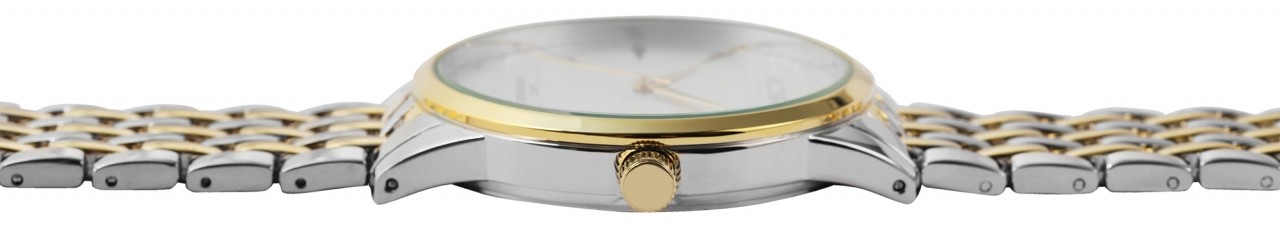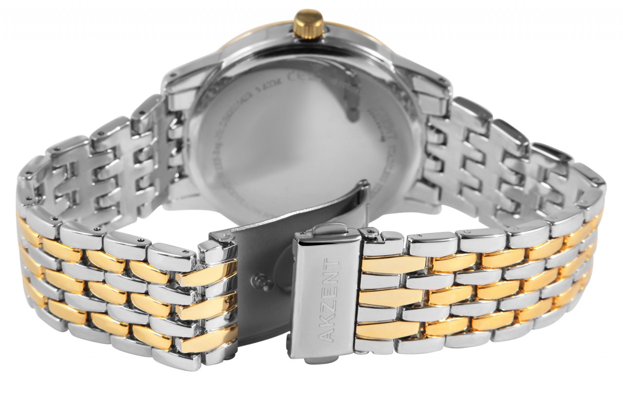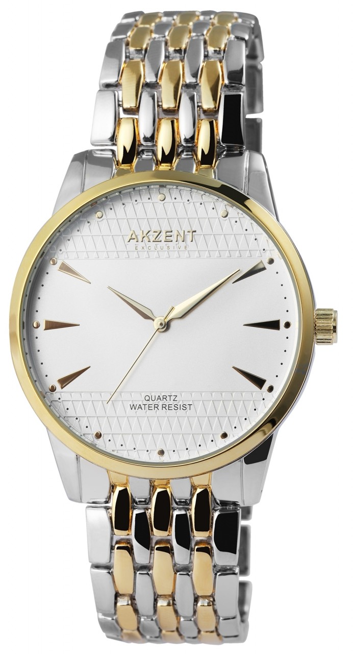 O relógio de pulso analógico de 3 ponteiros para homem da marca Akzent Exclusive possui um movimento de quartzo de alta qualidade. A bracelete metálica tem 22 mm de largura na extremidade e pode ser aberta e fechada com um fecho de correr. O comprimento total do relógio é de 22 cm. A caixa metálica com vidro mineral tem um diâmetro de 42 mm e uma altura de 9 mm. O fundo da caixa é feito de aço inoxidável e o relógio tem uma resistência à água de 3 bar. Um destaque visual é o mostrador, que está decorado com um subtil padrão triangular às seis e às doze horas. Existem também doze marcadores de pontos no mostrador e marcadores de linhas adicionais às duas, três, quatro, oito, nove e dez horas. Os ponteiros e os índices são da mesma cor e combinam bem com o aspeto geral do relógio.