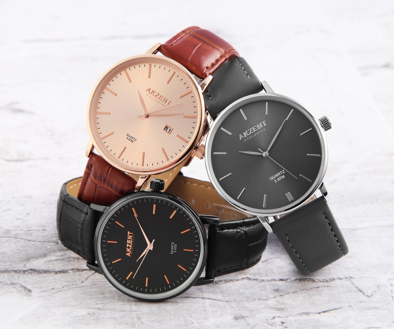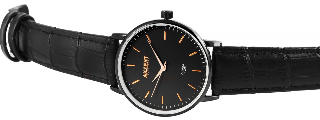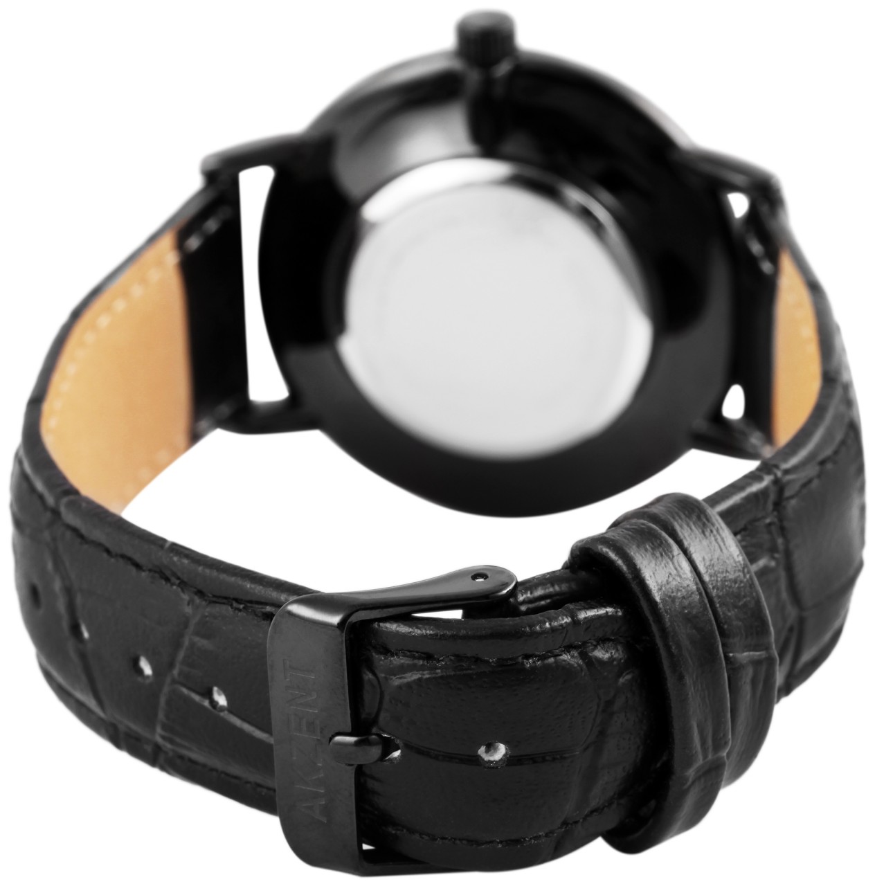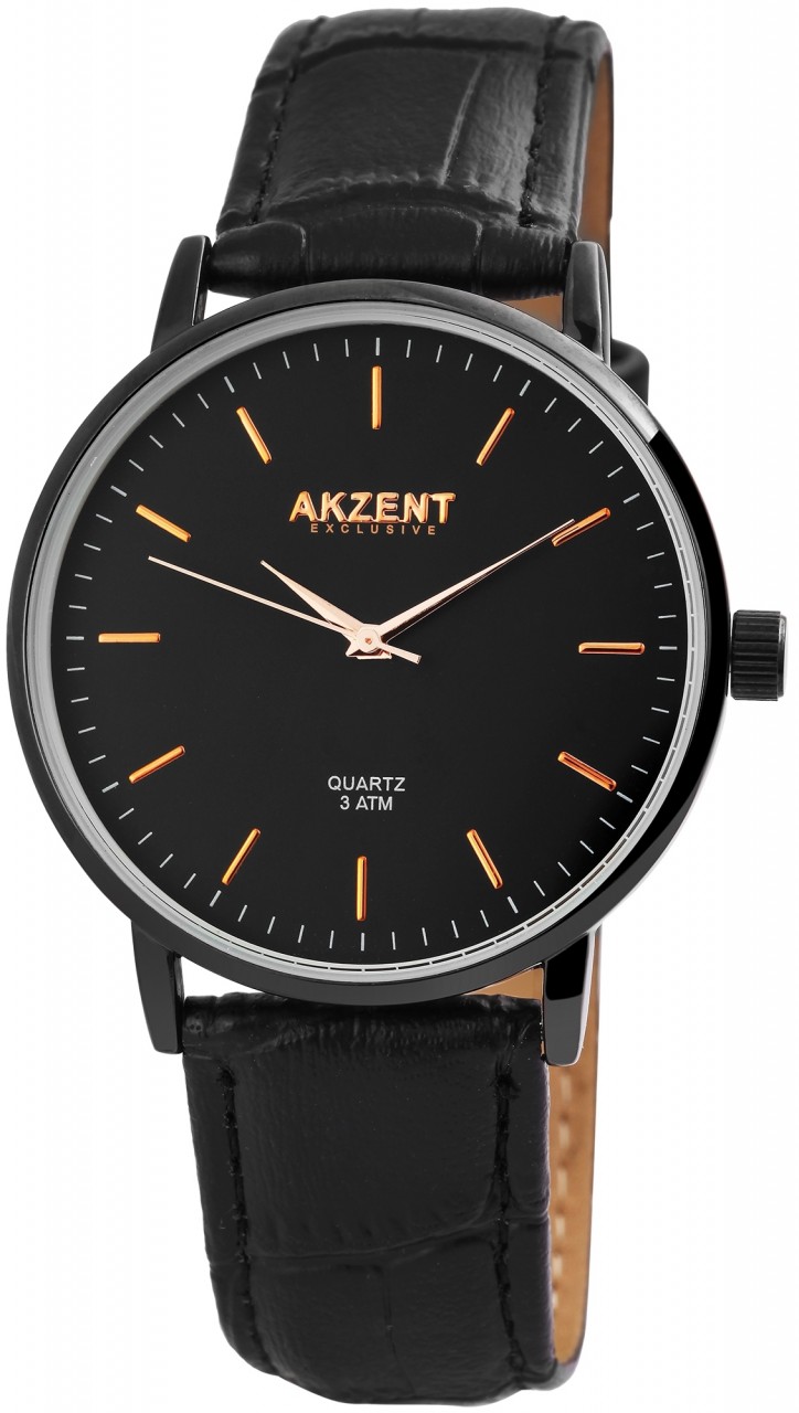 O relógio de pulso analógico de 3 ponteiros para homem da marca Akzent Exclusive possui um movimento de quartzo de alta qualidade. A bracelete em Pele Sintética com relevo de crocodilo tem 20 mm de largura no lug e pode ser aberta e fechada com uma fivela de pino. O comprimento total do relógio é de 24,5 cm. A caixa metálica com vidro mineral tem um diâmetro de 40 mm e uma altura de 8,5 mm. O fundo da caixa é feito de aço inoxidável e o relógio tem uma resistência à água de 3 bar. Os ponteiros e os índices são da mesma cor que a caixa e, por conseguinte, combinam na perfeição com o aspeto geral do relógio.