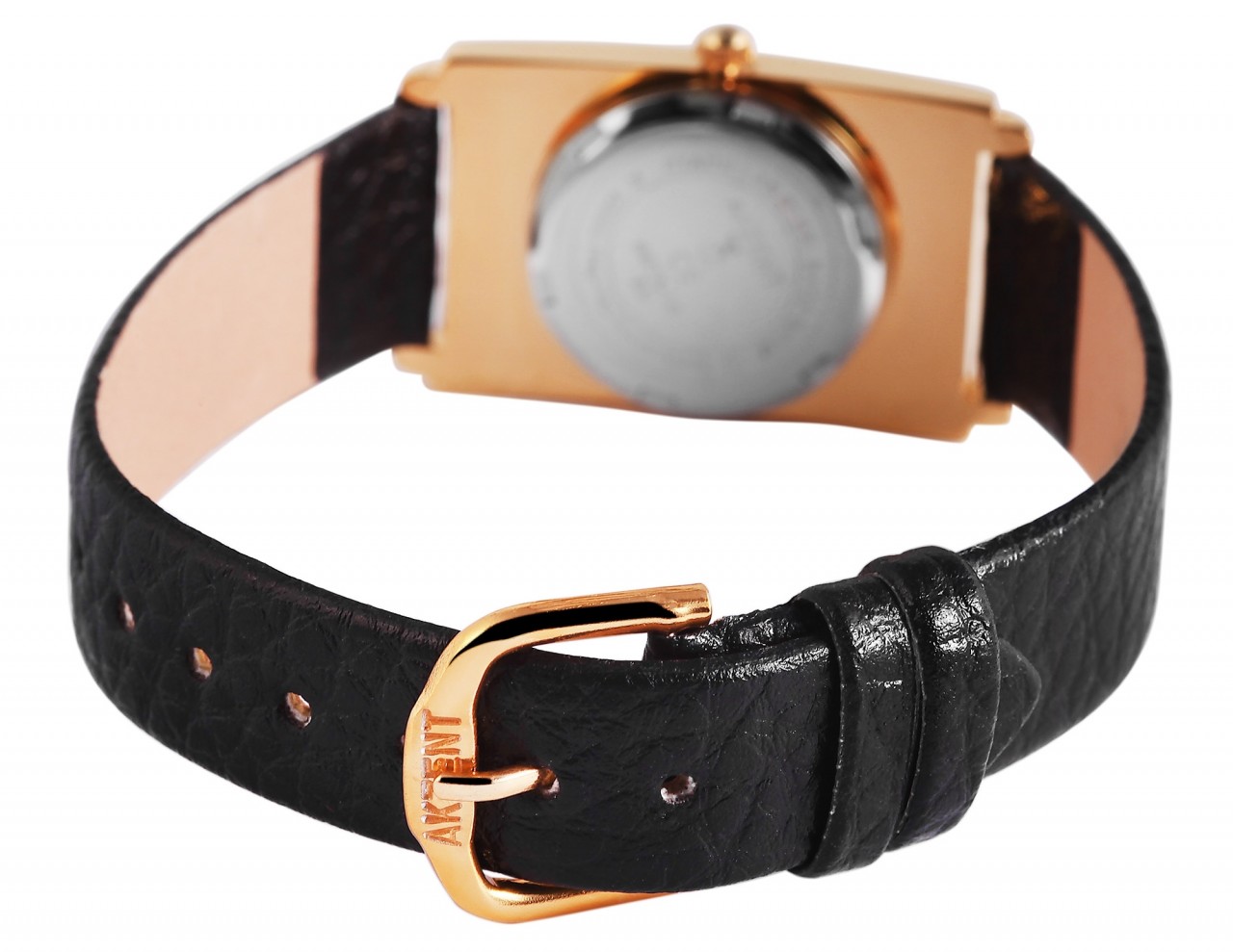 O relógio analógico feminino da marca Akzent possui movimento de quartzo de alta qualidade. A pulseira em imitação de couro tem 16 mm de largura e abre com uma fivela. O comprimento total é de 22 cm. A caixa de metal com vidro mineral tem dimensões de 23 x 33 mm e altura de caixa de 8 mm. A tampa da caixa é feita de aço inoxidável. O relógio é testado com pressão de 3 ATM.