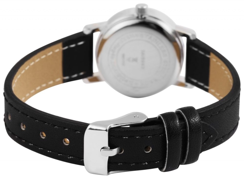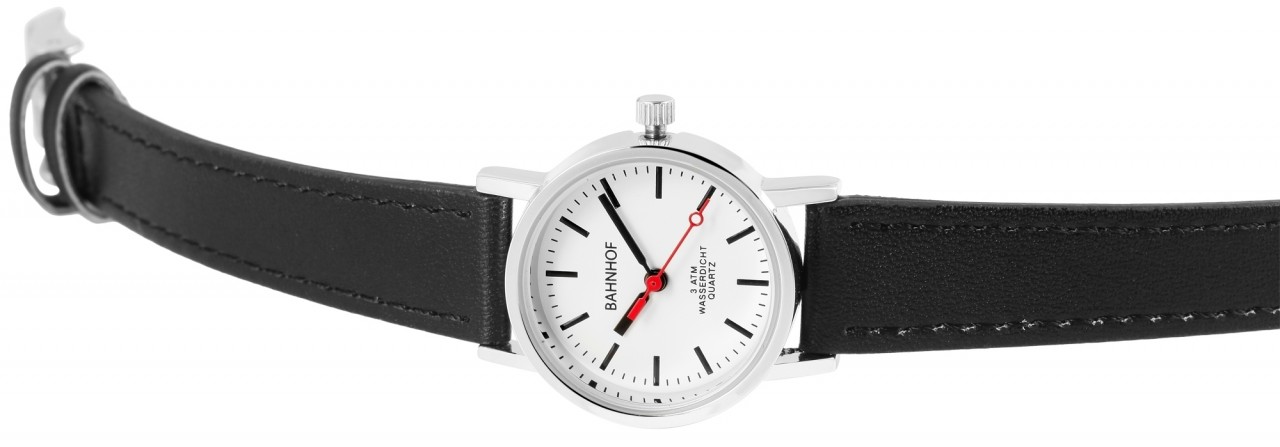 O relógio de pulso feminino de 3 ponteiros da marca Bahnhof possui um movimento de quartzo de alta qualidade. A pulseira em imitação de couro preta tem 14 mm de largura na alça e torna-se mais estreita na direção do fecho. O pequeno relógio feminino pode ser aberto e fechado com uma fivela prateada. O comprimento total do relógio é de 22,5 cm. A caixa de metal prateado com vidro mineral tem um diâmetro de 26 mm e uma altura de 9,5 mm. O fundo da caixa também é feito de aço inoxidável. O relógio também possui resistência à água de 3 ATM.