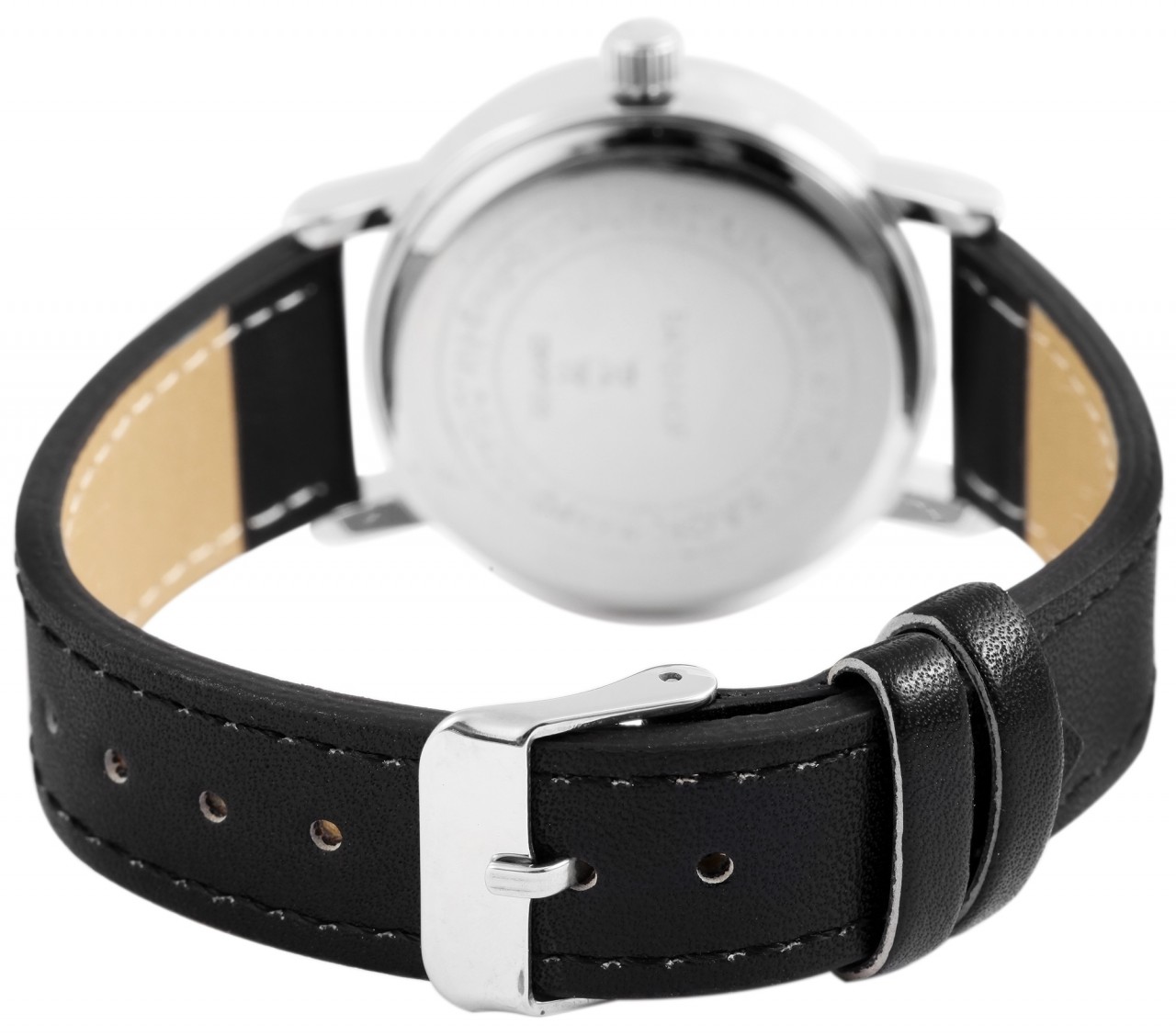O relógio de pulso analógico de 3 ponteiros para homem da marca Bahnhof tem um movimento de quartzo de alta qualidade. A bracelete em imitação de pele preta tem 18 mm de largura na extremidade. Pode ser aberta e fechada com uma fivela de pino prateada. O comprimento total do relógio é de 23,5 cm. A caixa metálica prateada com vidro mineral tem um diâmetro de 35 mm e uma altura de 10 mm. O fundo da caixa é feito de aço inoxidável. O mostrador é branco, os marcadores das horas e os ponteiros são pretos. As cores contrastantes facilitam a leitura das horas. O relógio tem também uma resistência à água de 3 ATM.