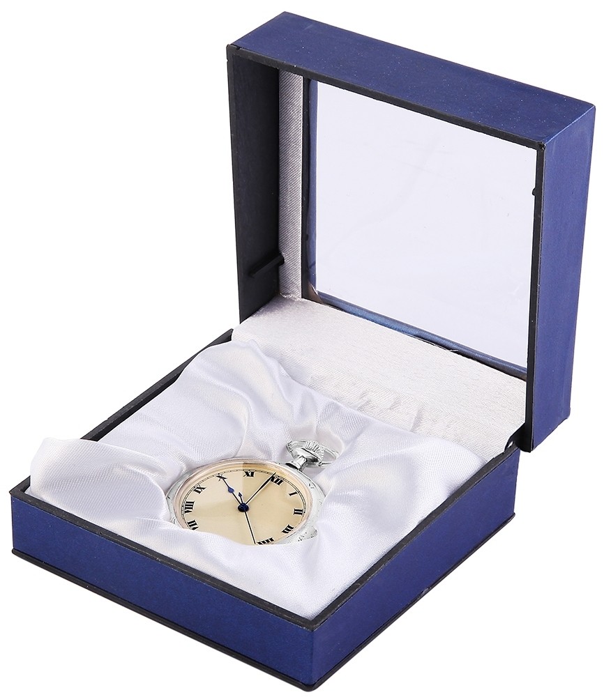O relógio de bolso analógico possui um movimento de quartzo de alta qualidade. A caixa de metal com vidro mineral tem dimensão de 44 mm e altura de caixa de 10 mm. A tampa da caixa é feita de aço inoxidável. Como acessórios para o seu produto você receberá: caixa original.