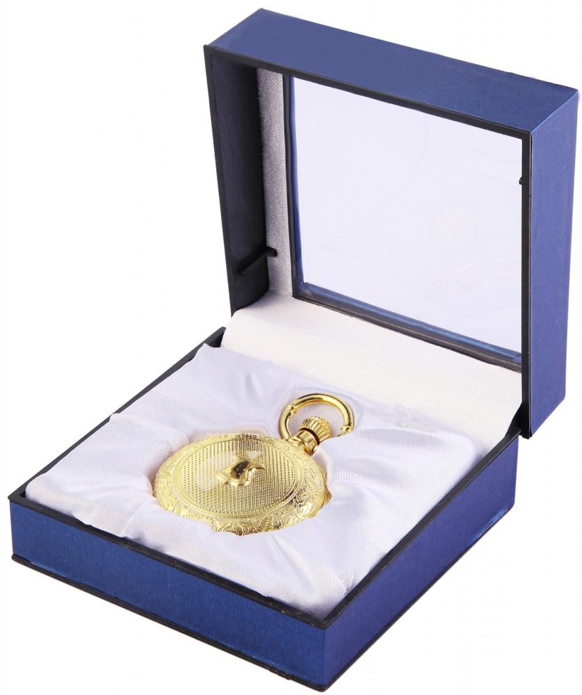 O relógio de bolso analógico possui um movimento de quartzo de alta qualidade. A caixa de metal com vidro mineral tem dimensão de 48 mm e altura de caixa de 18 mm. A tampa da caixa é feita de metal. Como acessórios para o seu produto você receberá: caixa original.