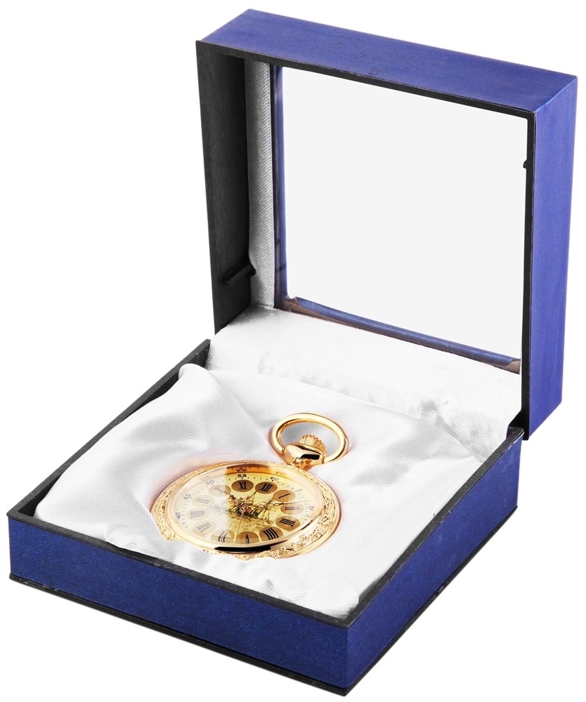 O relógio de bolso analógico possui um movimento de quartzo de alta qualidade. A caixa de metal com vidro mineral tem dimensão de 47 mm e altura de caixa de 12 mm. A tampa da caixa é feita de metal. Como acessórios para o seu produto você receberá: caixa original.