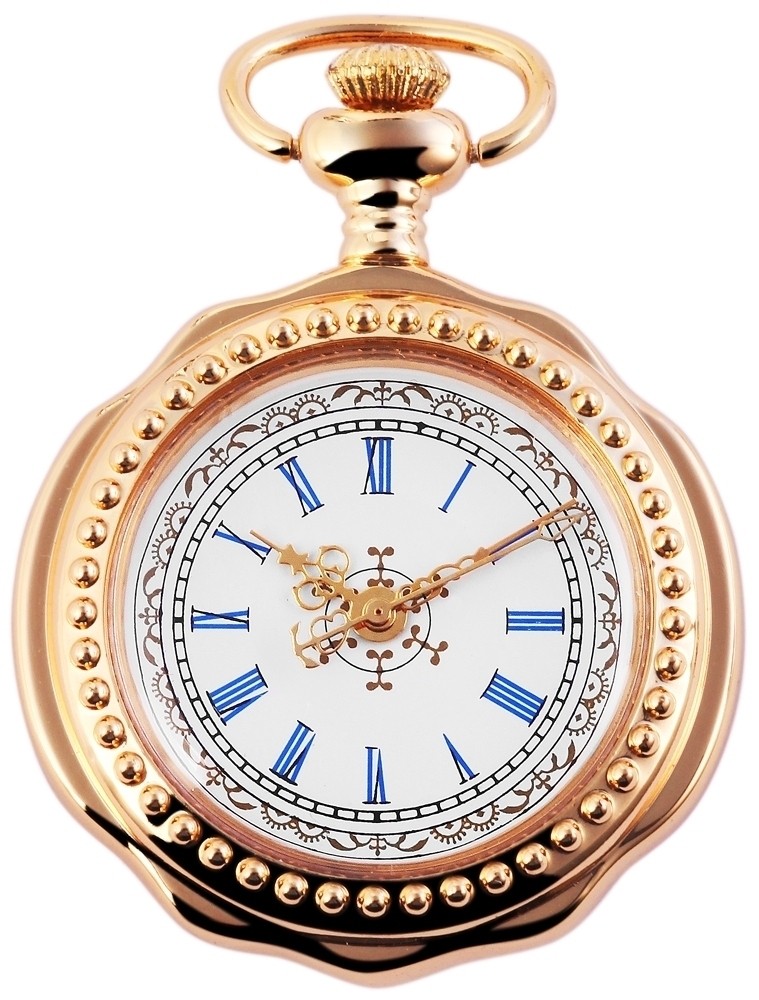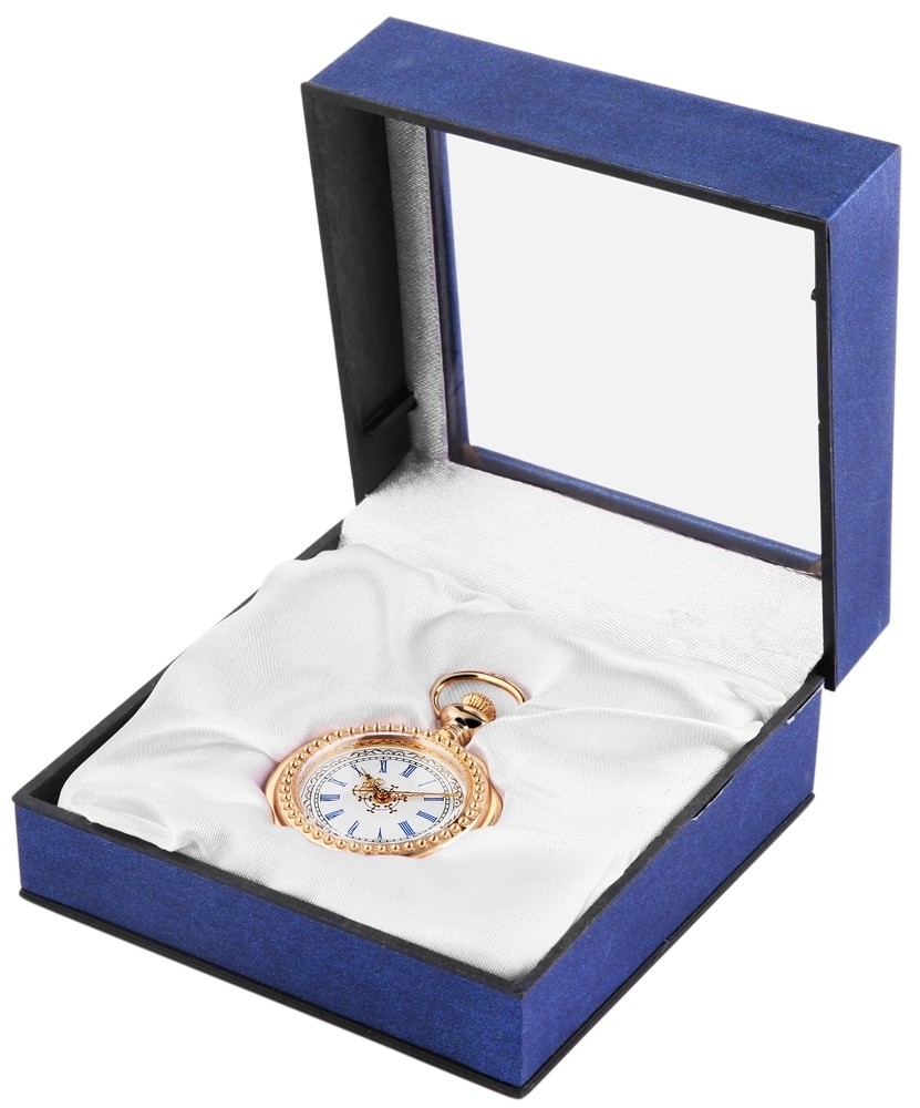 O relógio de bolso analógico possui um movimento de quartzo de alta qualidade. A caixa de metal com vidro mineral tem dimensão de 39 mm e altura de caixa de 14 mm. A tampa da caixa é feita de metal.