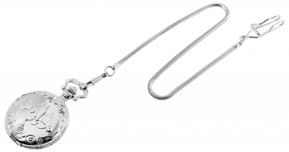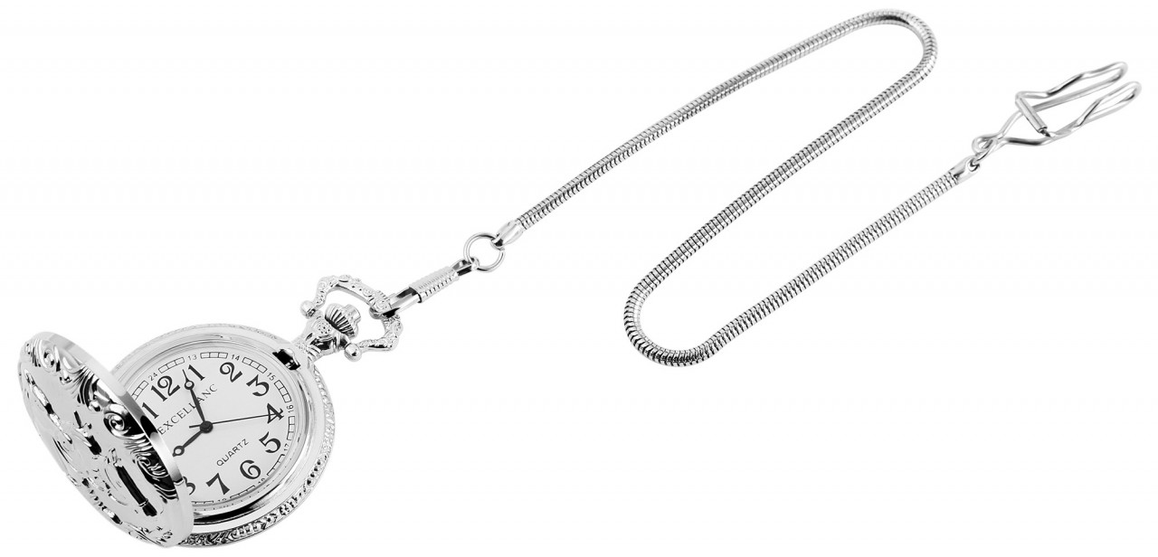 O relógio de bolso analógico de 3 ponteiros da marca Excellanc possui um movimento de quartzo de alta qualidade. A caixa redonda em metal está decorada com um padrão floral na parte de trás. A parte frontal mate está decorada com 3 cavalos no centro. O relógio de bolso clássico pode ser aberto com um botão de pressão integrado na coroa. Uma corrente de relógio de bolso de 30 cm de comprimento com um padrão de serpente está ligada ao relógio de bolso, permitindo que este seja preso de forma segura a uma mala ou a uma peça de vestuário. O mostrador do relógio é branco e apresenta grandes algarismos árabes pretos. Estes realçam o aspeto clássico do relógio de bolso e facilitam particularmente a leitura das horas. O relógio está igualmente equipado com um vidro de plástico ligeiramente curvo. O relógio tem um diâmetro de 47 mm e uma altura de caixa de 16 mm.