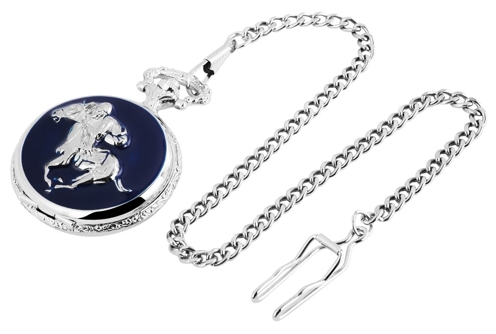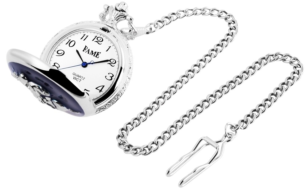 O relógio de bolso analógico da marca Fame possui um movimento de quartzo de alta qualidade. A caixa metálica com vidro mineral mede 47 mm e tem 17 mm de altura. A tampa da caixa é feita de metal.