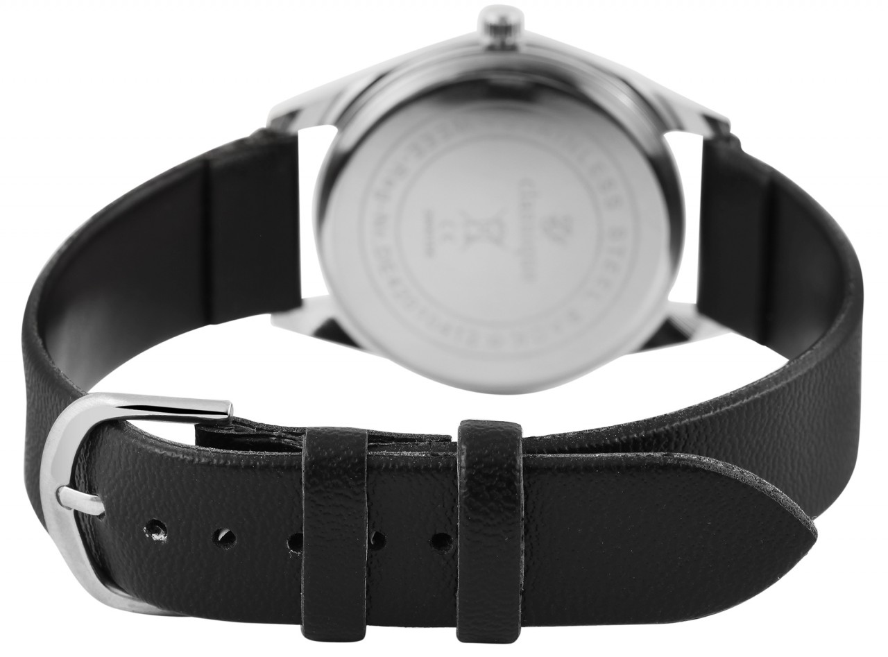 O relógio de pulso analógico masculino de 3 ponteiros da Classique possui um movimento de quartzo de alta qualidade. A pulseira de imitação de couro tem 20 mm de largura na alça e estreita 2 mm, de modo que a alça do fecho tem 18 mm. O relógio pode ser aberto e fechado com uma fivela. O comprimento total do relógio é de 25 cm. A caixa de metal com vidro mineral tem um diâmetro de 40 mm e uma altura de 8 mm. O fundo da caixa é feito de aço inoxidável. O mostrador simples tem uma cor contrastante para que a hora possa ser lida rapidamente.