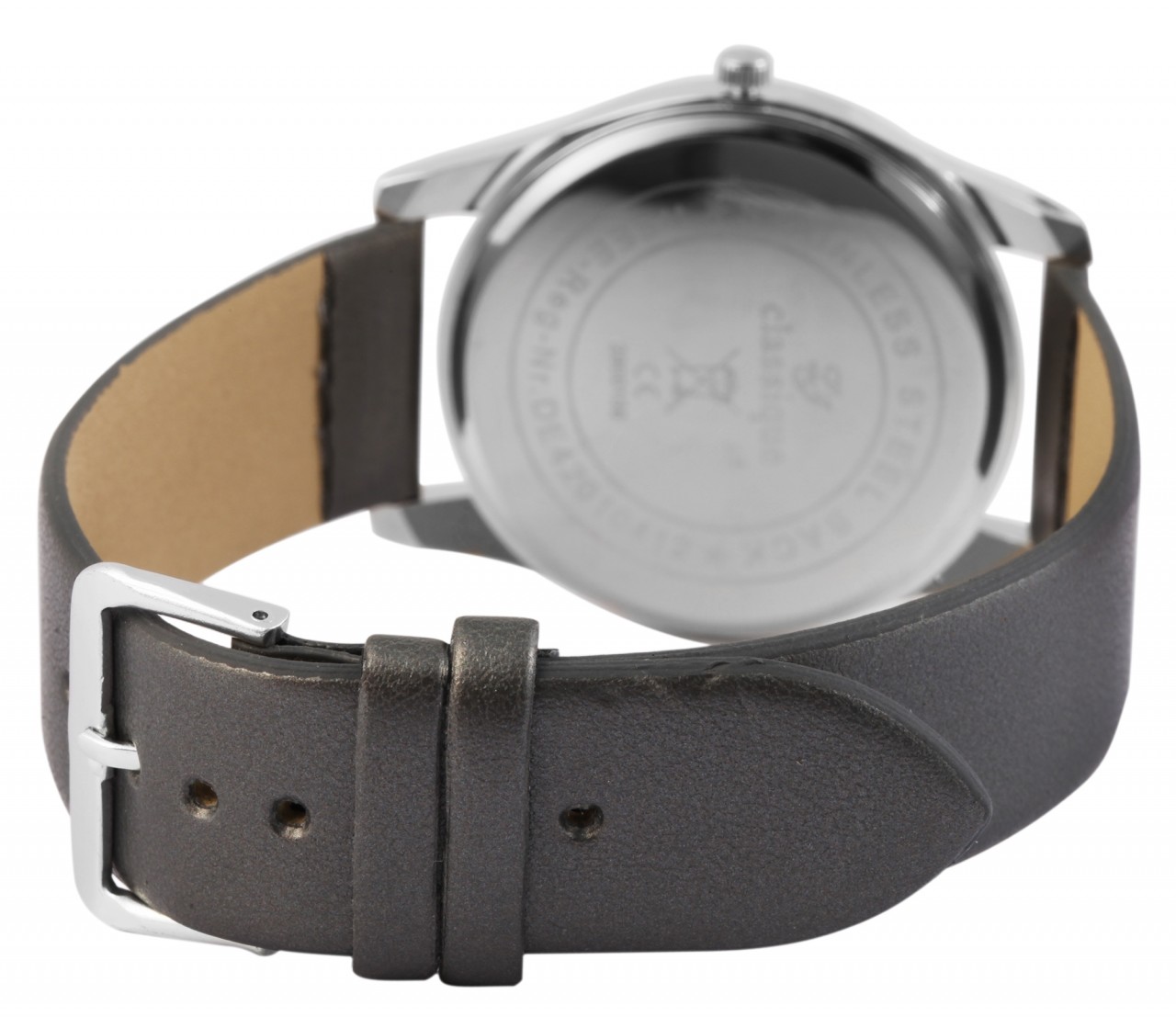 O relógio de pulso analógico masculino de 3 ponteiros da Classique possui um movimento de quartzo de alta qualidade. A pulseira em pele sintética tem 20 mm de largura na alça e estreita 2 mm, de modo que a alça do fecho tem 18 mm. O relógio pode ser aberto e fechado com uma fivela. O comprimento total do relógio é de 25 cm. A caixa de metal com vidro mineral tem um diâmetro de 40 mm e uma altura de 8 mm. O fundo da caixa é feito de aço inoxidável. O mostrador simples tem uma cor contrastante para que a hora possa ser lida rapidamente. O relógio é o acessório perfeito para qualquer roupa, pois o estilo clássico combina com qualquer ocasião.