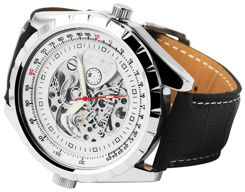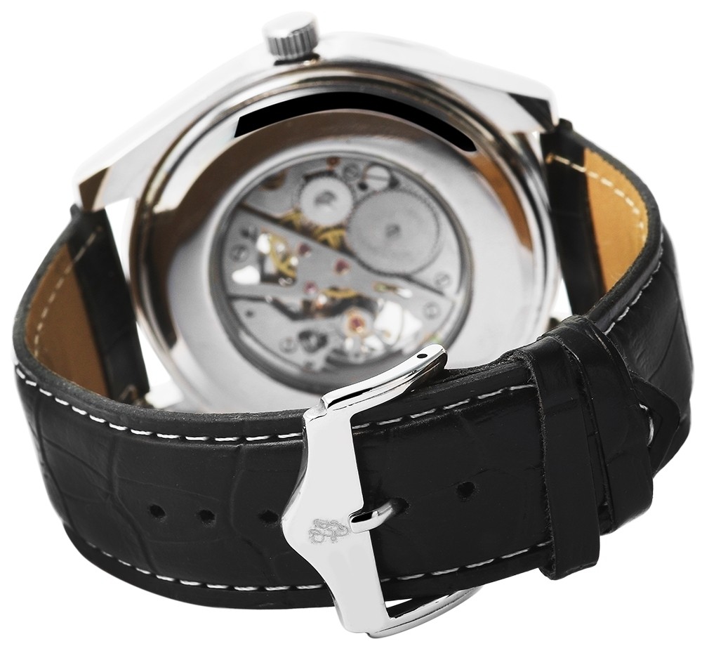O relógio analógico masculino da marca Classique possui movimento mecânico de alta qualidade. A pulseira em pele sintética tem 24 mm de largura e abre com uma fivela. O comprimento total é de 23 cm. A tampa da caixa é feita de metal com base de vidro.