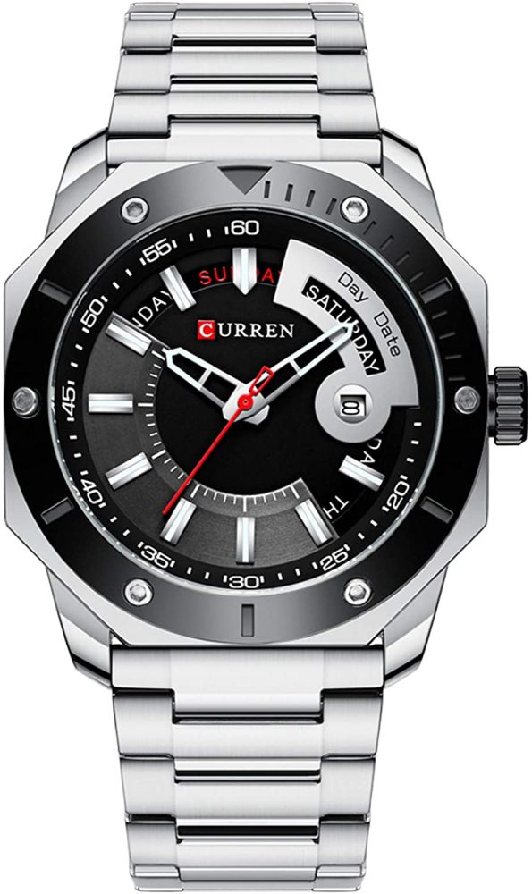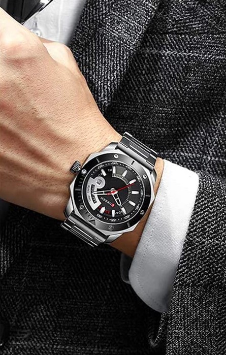 Tampa traseira de aço inoxidável Garantia de um ano em movimento Links 100% ajustáveis Espessura da caixa de 13 MM 153g – 75g de peso Largura de banda de 24 MM comprimento da banda 240mm Resistência à água 30M Resista à água de respingos