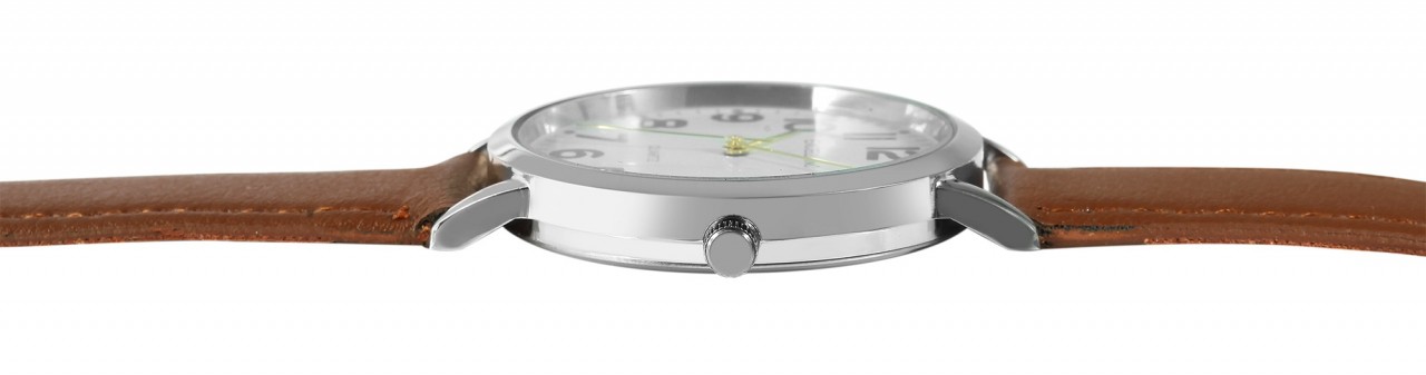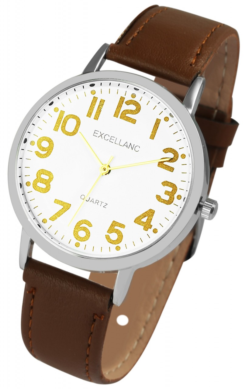 O relógio de pulso analógico de 3 ponteiros para homem da Excellanc possui um movimento de quartzo preciso e de alta qualidade. A pulseira em imitação de couro tem 18 mm de largura nas alças e pode ser aberta e fechada com uma fivela. A pulseira do relógio garante um ajuste confortável e cabe confortavelmente no seu pulso. O comprimento total do relógio é de 24 cm. A caixa de metal com vidro mineral tem um diâmetro de 39 mm e uma altura de 7 mm. A hora pode ser lida facilmente graças ao mostrador transparente com grandes números em estilo árabe. Graças à sua silhueta esbelta, este relógio masculino cabe sob qualquer manga de camisa e pode ser usado idealmente para uma reunião de negócios, mas também como um relógio básico na vida cotidiana.
