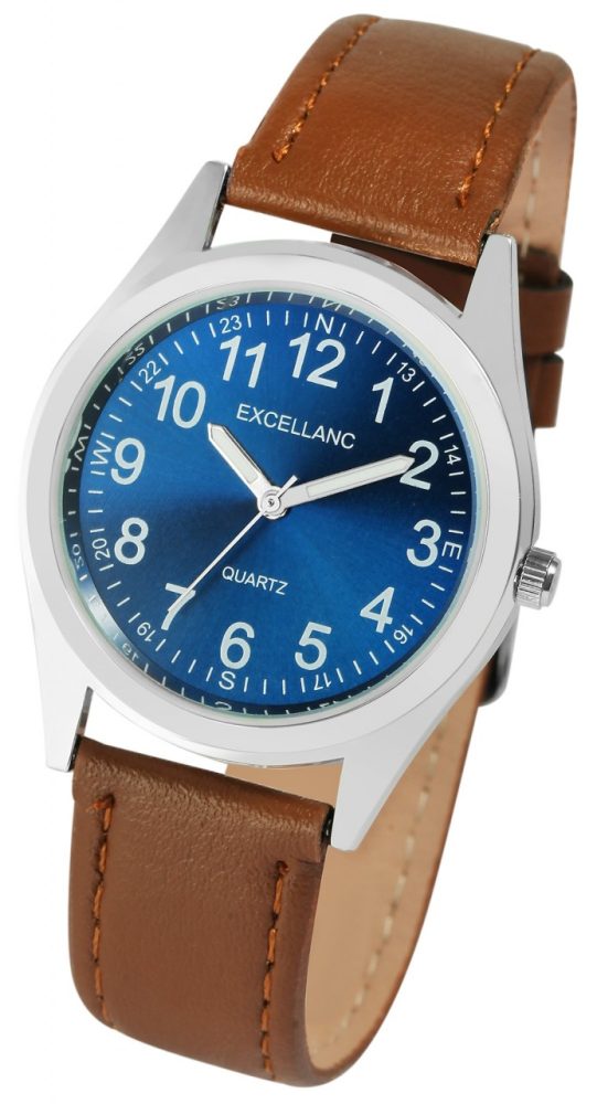 O relógio de pulso analógico de 3 ponteiros para homem da Excellanc possui um movimento de quartzo preciso e de alta qualidade. A pulseira em imitação de couro tem 18 mm de largura nas alças e pode ser aberta e fechada com uma fivela. A pulseira do relógio garante conforto de uso ideal e cabe confortavelmente no pulso. O comprimento total do relógio é de 24 cm. A caixa de metal com vidro mineral tem um diâmetro de 35 mm e uma altura de 7 mm. A hora pode ser lida facilmente graças ao mostrador claro com números em estilo árabe. Graças aos ponteiros revestidos com Superluminova, isto também é possível no escuro. Graças à sua silhueta esbelta, este relógio masculino cabe sob qualquer manga de camisa e pode ser usado idealmente para uma reunião de negócios, mas também como um relógio básico na vida cotidiana.
