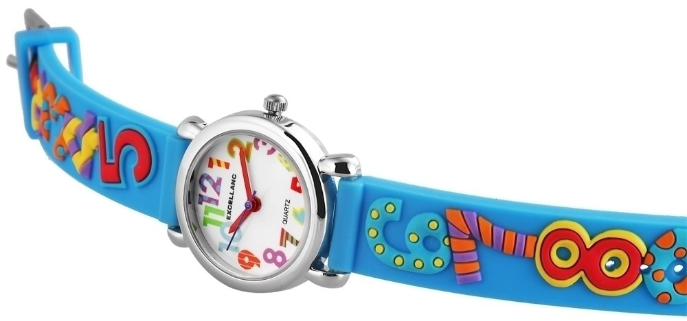O relógio de pulso infantil analógico de 3 ponteiros da Excellanc possui o movimento de quartzo PC21 de alta qualidade. A pulseira de silicone tem 14 mm de largura na alça e pode ser aberta e fechada com uma fivela. O comprimento total do relógio é de 20 cm. A caixa de metal com vidro mineral tem um diâmetro de 27 mm e uma altura de 10 mm. O fundo da caixa é feito de aço inoxidável. A pulseira de borracha colorida garante que seja confortável de usar. Os números de um a doze podem ser encontrados nele e criam uma bela conexão com o mostrador. Este é branco e impresso com doze números coloridos. Além disso, os ponteiros das horas e dos minutos são vermelhos e o ponteiro dos segundos é roxo.