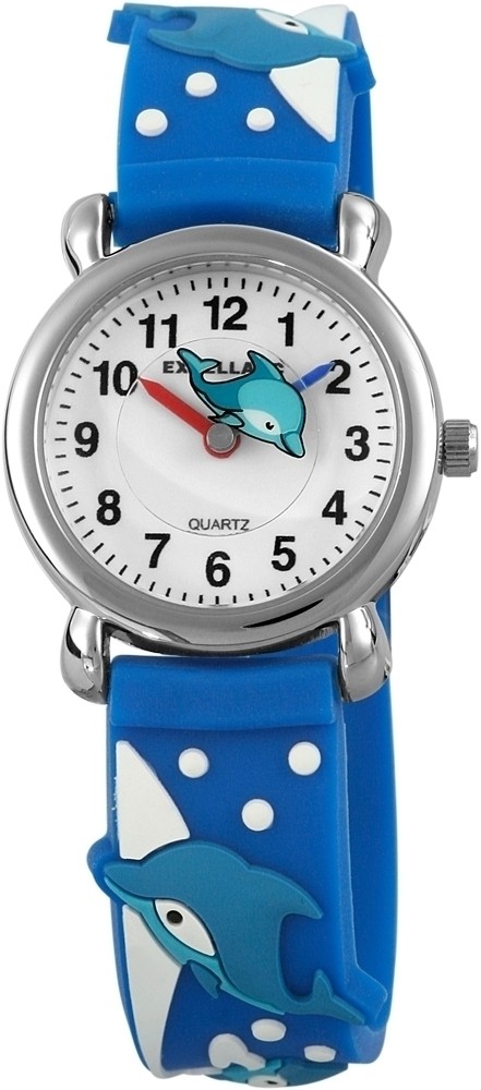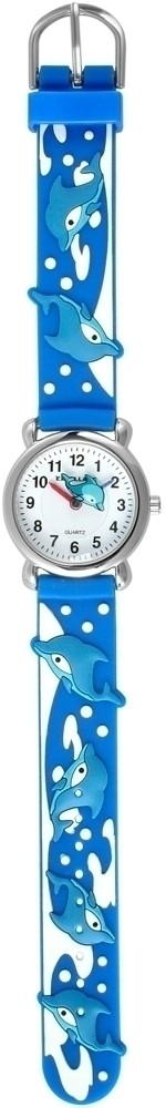 O relógio de pulso infantil analógico de 3 ponteiros da Excellanc possui o movimento de quartzo PC21 de alta qualidade. A pulseira de silicone tem 14 mm de largura na alça e pode ser aberta e fechada com uma fivela. O comprimento total do relógio é de 20 cm. A caixa de metal com vidro mineral tem um diâmetro de 27 mm e uma altura de 10 mm. O fundo da caixa é feito de aço inoxidável. A pulseira de borracha colorida é decorada com vários motivos de golfinhos e garante conforto de uso. O mostrador é branco e impresso com números pretos. O ponteiro das horas é vermelho e o ponteiro dos minutos é azul. O ponteiro especial dos segundos consiste em uma placa fina e transparente impressa com um pequeno golfinho azul.