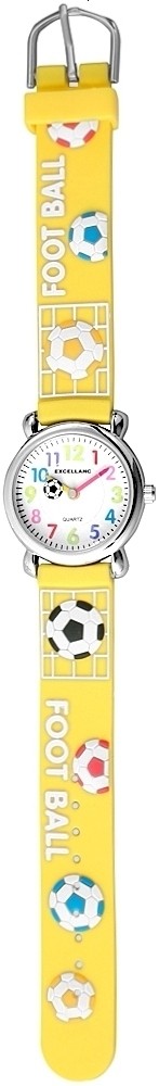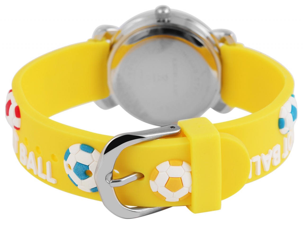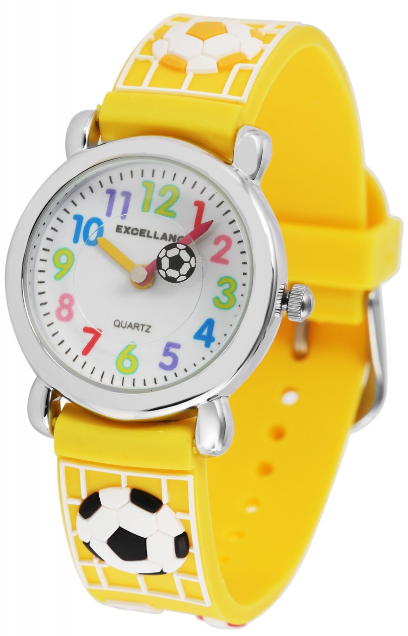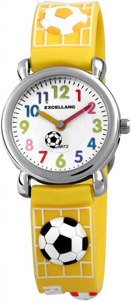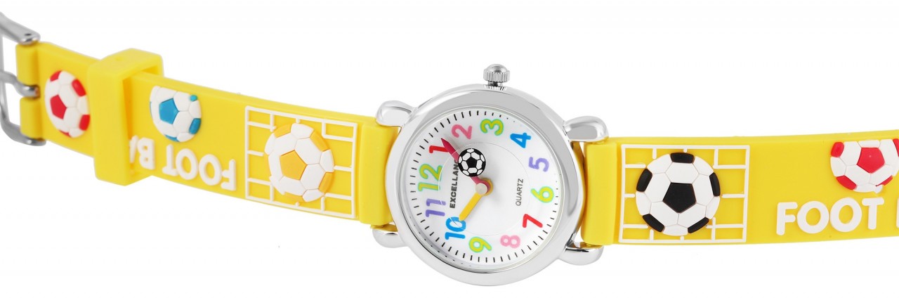 O relógio infantil analógico de 3 ponteiros da Excellanc possui um movimento de quartzo PC21 de alta qualidade. A pulseira de silicone tem 14 mm de largura e abre com uma fivela. O comprimento total é de 20 cm. A caixa de metal com vidro mineral tem um diâmetro de 27 mm e uma altura de 10 mm. A tampa da caixa é feita de aço inoxidável. Os ponteiros são vermelhos e amarelos, o que proporciona um bom contraste no mostrador branco, facilitando a leitura das horas nos relógios de pulso. O destaque fica por conta do motivo do futebol, que adorna tanto a pulseira de silicone quanto o ponteiro dos segundos do relógio infantil.
