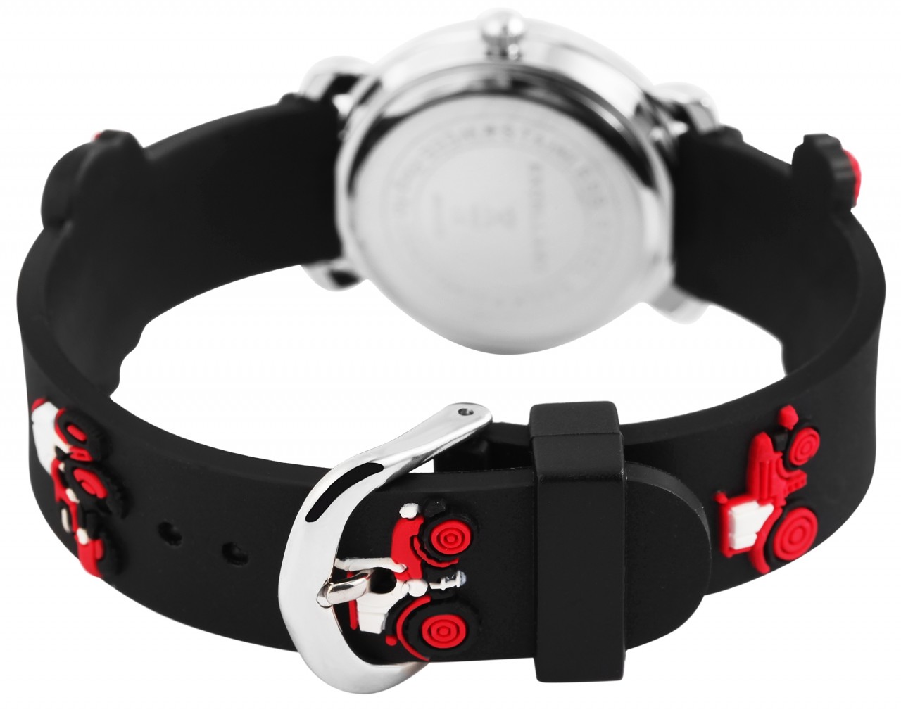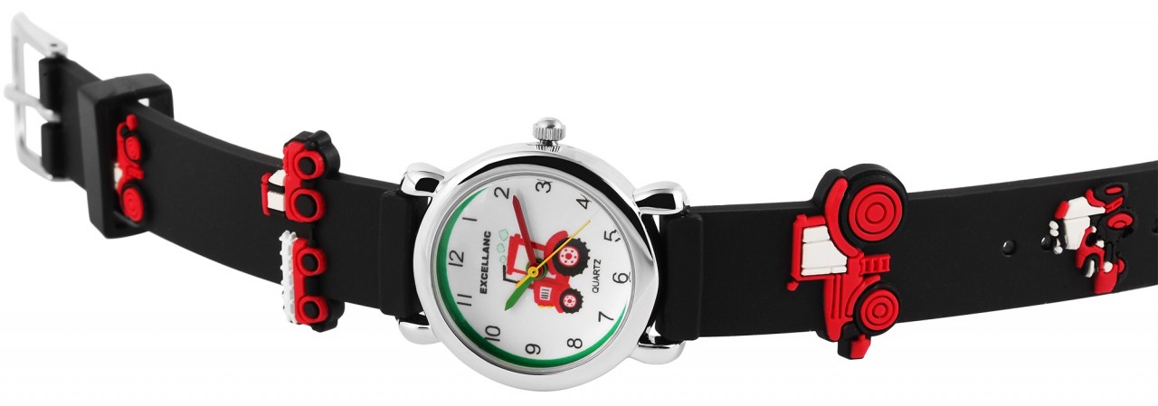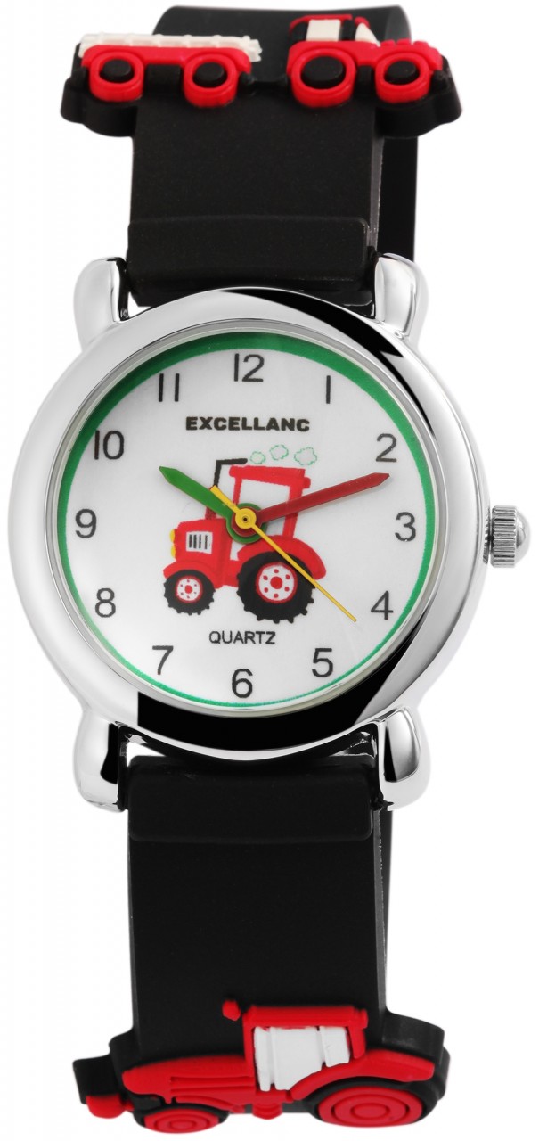 O relógio de pulso infantil analógico de 3 ponteiros da Excellanc possui o movimento de quartzo PC21 de alta qualidade. A pulseira de silicone tem 14 mm de largura na alça e pode ser aberta e fechada com uma fivela. O comprimento total do relógio é de 20 cm. A caixa de metal com vidro mineral tem um diâmetro de 27 mm e uma altura de 10 mm. O fundo da caixa é feito de aço inoxidável. A pulseira de borracha é decorada com vários motivos de trator e garante conforto de uso. O mostrador é branco e impresso com números pretos. Além disso, o mostrador é decorado com uma faixa colorida na borda externa e um grande motivo de trator no meio. O ponteiro das horas é verde, o ponteiro dos minutos é vermelho e o ponteiro dos segundos é amarelo. Isso torna o aprendizado e a leitura mais fáceis.