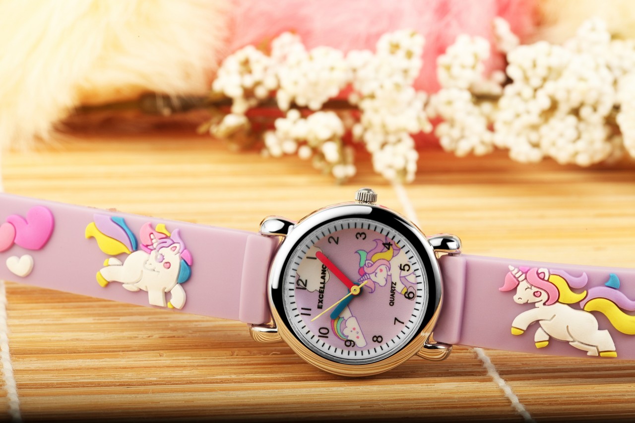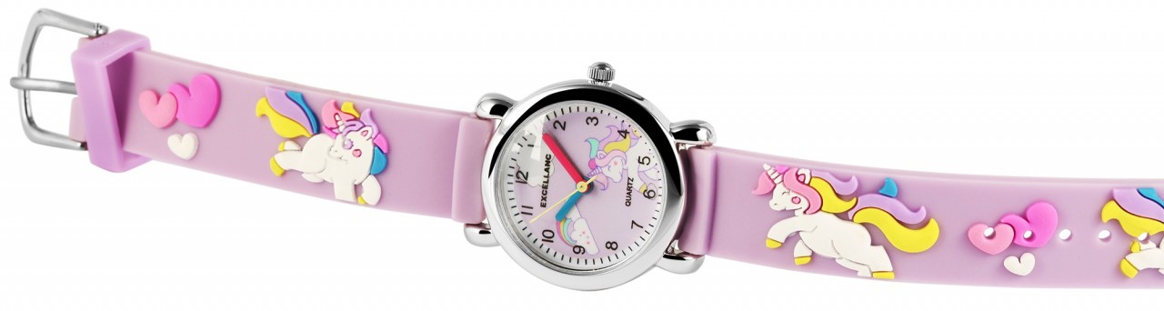 O relógio de pulso infantil analógico de 3 ponteiros da Excellanc possui o movimento de quartzo PC21 de alta qualidade. A pulseira de silicone tem 14 mm de largura na alça e pode ser aberta e fechada com uma fivela. O comprimento total do relógio é de 20 cm. A caixa de metal com vidro mineral tem um diâmetro de 27 mm e uma altura de 10 mm. O fundo da caixa é feito de aço inoxidável. A pulseira de borracha colorida é decorada com vários motivos de unicórnios e garante conforto de uso. O mostrador tem a mesma cor da pulseira do relógio e é impresso com números e índices pretos. Os motivos da pulseira…