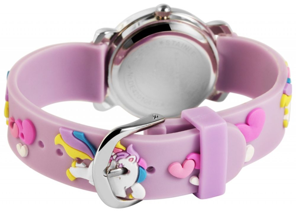 O relógio de pulso infantil analógico de 3 ponteiros da Excellanc possui o movimento de quartzo PC21 de alta qualidade. A pulseira de silicone tem 14 mm de largura na alça e pode ser aberta e fechada com uma fivela. O comprimento total do relógio é de 20 cm. A caixa de metal com vidro mineral tem um diâmetro de 27 mm e uma altura de 10 mm. O fundo da caixa é feito de aço inoxidável. A pulseira de borracha colorida é decorada com vários motivos de unicórnios e garante conforto de uso. O mostrador tem a mesma cor da pulseira do relógio e é impresso com números e índices pretos. Os motivos da pulseira…