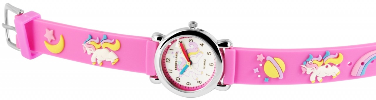 O relógio de pulso infantil analógico de 3 ponteiros da Excellanc possui o movimento de quartzo PC21 de alta qualidade. A pulseira de silicone tem 14 mm de largura na alça e pode ser aberta e fechada com uma fivela. O comprimento total do relógio é de 20 cm. A caixa de metal com vidro mineral tem um diâmetro de 27 mm e uma altura de 10 mm. O fundo da caixa é feito de aço inoxidável. A pulseira de borracha colorida é decorada com dois grandes unicórnios e vários motivos do sistema solar e garante conforto de uso. O mostrador é branco e impresso com números e índices pretos. Há também um grande motivo de unicórnio no mostrador. O ponteiro das horas é azul, o ponteiro dos minutos é vermelho e o ponteiro dos segundos é amarelo. Isso torna o aprendizado e a leitura mais fáceis.
